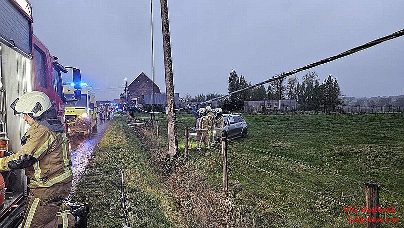 Wagen raakt van de weg, boort zich door gracht, maait elektriciteitspaal om en komt in weide tot stilstand