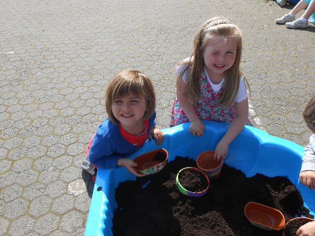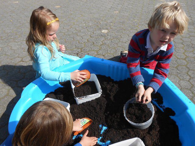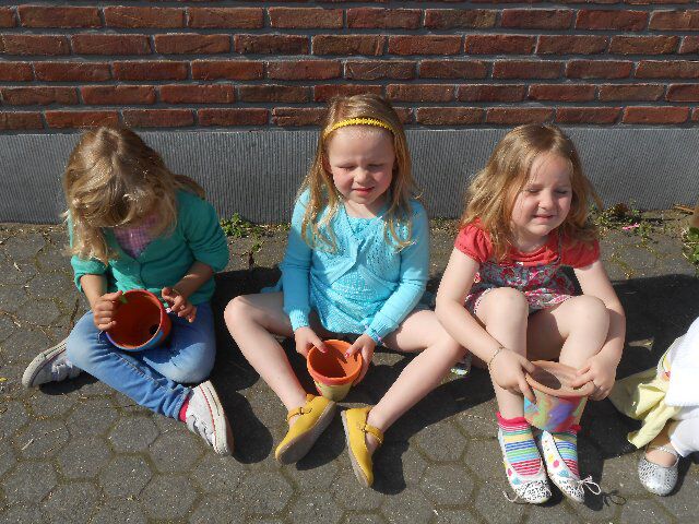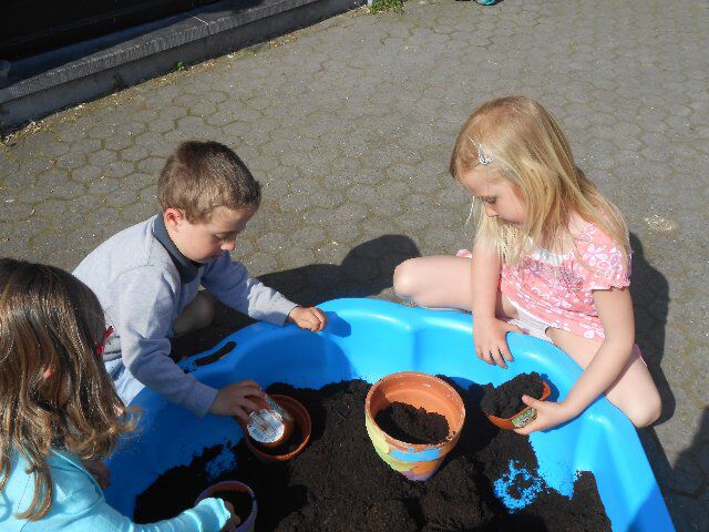 Vandaag hebben we in onze geschilderde bloempotten zonnebloemzaadjes geplant. We mochten ook pompoenzaadjes planten, die gaan dan later in ons eigen tuintje op de speelweide! Bedankt Pedro van het oudercomité!