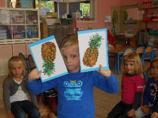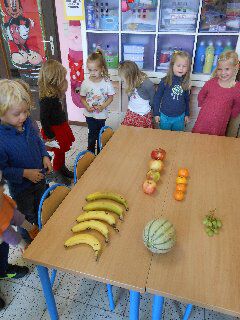 Wij hebben gewerkt rond het thema "mmmm... lekker fruit!" De kleuters brachten verschillende soorten fruit mee: appels, bananen, druiven, meloen, mandarijntjes en zelfs een ananas en een kokosnoot. Heel erg bedankt aan alle mama's en papa's! Kobe zijn appel was supergroot en hij ging hem zelf plukken! We sorteerden al het fruit en telden hoeveel stuks we van elke soort hadden. We sneden een appel open en bekeken het klokhuis eens goed, de pitjes, het steeltje, het kroontje, de schil... Natuurlijk mochten we alles daarna proeven!