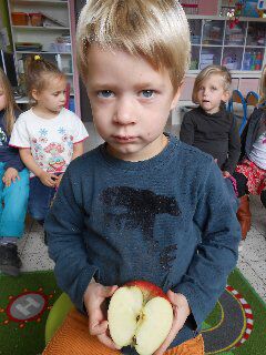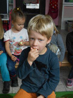 We luisterden naar het verhaal "Anna eet graag fruit", maakten fruitkronen en mochten appeltjes maken in speeldeeg! Die appeltjes moesten dan ook nog gebakken worden in de oven.