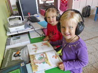 In de boekenhoek luisterden we naar het boek "Pluim en de appeldief"