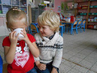 Woensdag wilden we proeven van de kokosnotenmelk en van de kokosnoot, maar wat we ook probeerden we kregen de noot niet open! Gelukkig had Kobe een idee: zijn vake had thuis een boormachine en met die machine zou hij de noot wel open krijgen zei Kobe... Kobe kreeg de noot mee naar huis en daar heeft zijn moeke, niet zijn vake , de noot voor ons opengeboord! Gelukkig zijn er nog hele sterke moekes in ons klasje... Donderdag hebben we dan van de melk gedronken en van het vruchtvlees van de kokosnoot geproefd.