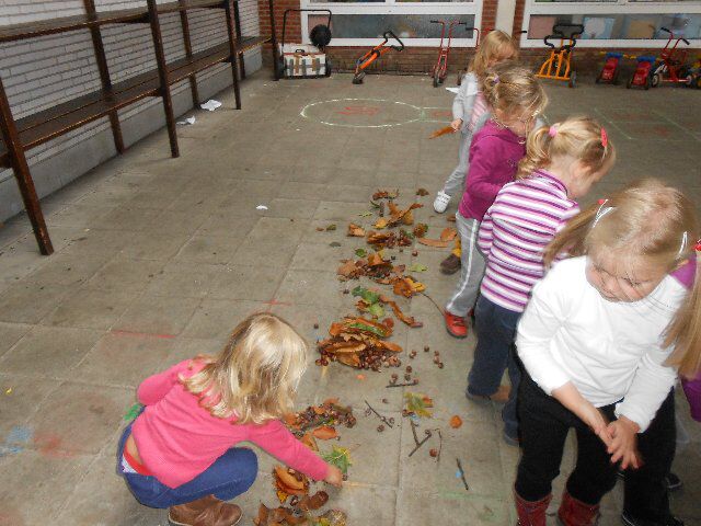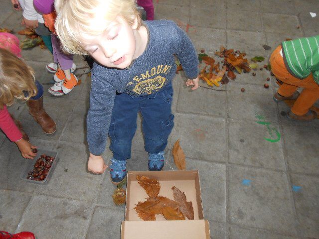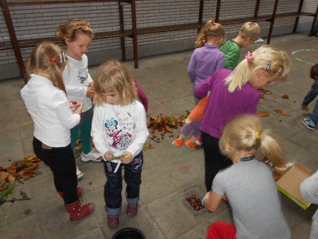 We hadden echte paddestoelen in de klas: we mochten er allemaal eens naar kijken maar er zeker niet aankomen want ze waren giftig! We hebben ook alles gesorteerd wat we meebrachten uit het bos: blaadjes, eikels, kastanjes...