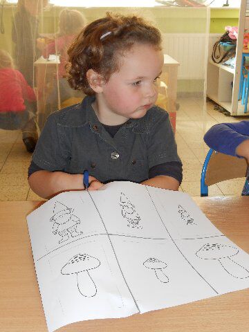 Daarna speelden we een spelletje: we moesten de kabouters bij de juiste paddestoel leggen: er waren grote en kleine kabouters en grote en kleine paddestoelen. De kleuters maakten de oefening daarna nog een keer zelfstandig tijdens een knip en plakmoment.