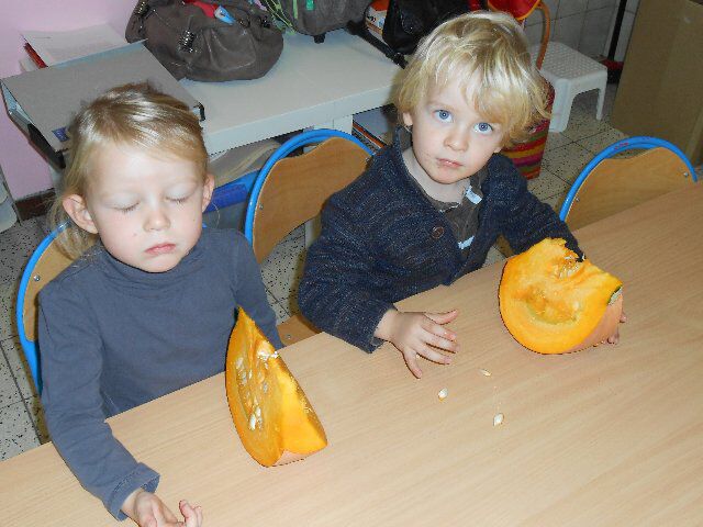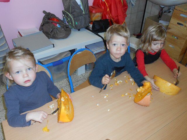 Maandag 21 oktober Jane, Britt en Jan brachten een pompoen mee naar de klas. We sneden al een stuk uit één van de drie, keken hoe die er vanbinnen uitzag en maakten er dan een gezichtje in!