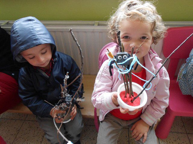 We maakten ook spinnewebben met takjes en wol waarin we zelfgemaakte spinnen (van een zwart geschilderde eierdoos en chenilledraad) mochten zetten!