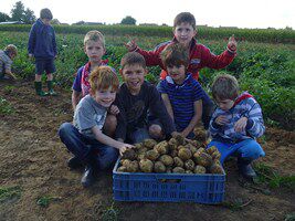 TOET TOEEET ! 16 uur. Boer Jo wacht op ons met de kar om ons naar het aardappelveld te brengen. Daar rapen we aardappelen om ter meest!