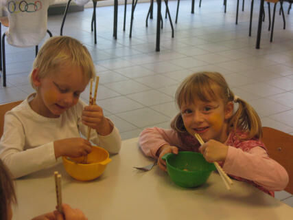 Vandaag maakten we samen met het vijfde en zesde leerjaar van juf Petra een chinese maaltijd klaar: mie met kip in de wok. We proefden dit gerecht met behulp van chinese stokjes. We sjabloneerden onze t-shirts met de vrede-karakters en de olympische ringen! Een fijne namiddag met de grootsten van de school!
