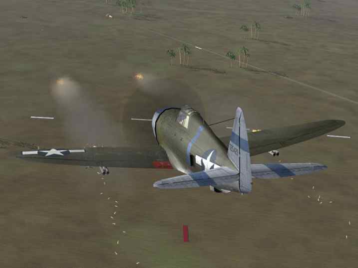 Amerikaanse jachtbommenwerper. Het is vroeg in de morgen als we hier opstijgen met 6 van onze Thunderbolt's beladen met bommen.Hoofdopdracht is een vliegveld van de Japanners aanvallen op het eiland Tinian.Eenmaal dit vliegveld op lage hoogte genadert zetten al onze vliegtuigen de bomaanval in.Hierbij weet ik 1 gronddoel te vernietigen.Blijkbaar is er geen enkel vijandelijk vliegtuig te bespeuren op dit vliegveld,en hebben de Japaners het vliegveld net ontruimd.Na onze bomaanval keren al onze toestellen terug naar ons vliegveld.Hiermee is mijn score voor vernietigde gronddoelen gestegen tot 4 stuks.