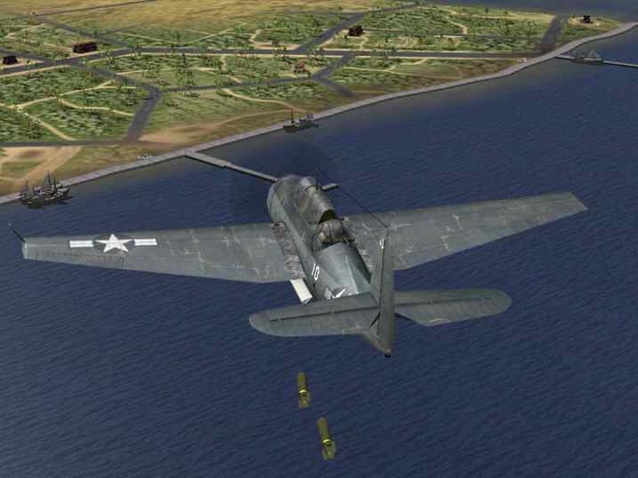 Amerikaanse bommenwerper // Amerikaanse jachtbommenwerper. Opnieuw stijgen we hier op met 4 van onze Thunderbolt's beladen met bommen,om een bomaanval uit te voeren op het eiland Tinian.Als wij opstijgen is boven het eiland Tinian een eenzame SBD bommenwerper op verkenning.Als we eenmaal het eiland naderen,keert de Dauntless terug naar zijn vliegdekschip,en kunnen we de bunkers en het Japanse geschut bombarderen.Tijdens deze aanval missen mijn twee bommen hun doel.Eenmaal de bommen gelost,word de thuisbasis terug opgezocht.