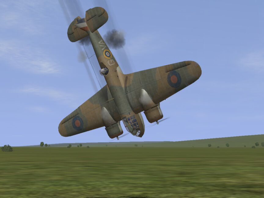 Belgisch jachtvliegtuig // Britse bommenwerper. 1939,België.België was in 1939 nog neutraal,toch werden er vluchten uitgevoerd door Franse,Britse en Duitse vliegtuigen boven België.Deze vliegtuigen werden dan door Belgische jagers onderschept,en indien de indringer niet wilde landen,werd deze neergehaald.Dit gebeurde zowel bij Duitse als Britse en Franse vliegtuigen,pas later werden afspraken gemaakt met de Britten en Fransen voor het gebruik van het Belgische luchtruim.Hier zijn we in de lucht met een Hurricane jachtvliegtuig,om een patroulje vlucht uit te voeren.Hierbij ontdek ik een Britse Blenheim bommenwerper,die blijkbaar terugkeerd van een missie boven Duitsland.Meteen naderen we deze bommenwerper,maar worden onder vuur genomen door de Britse boordschutter.Hierop beantwoord ik het vuur met een aanval,waarbij de twee motoren van de Blenheim zwaar beginnen te roken.Even later merk ik dat de bommenwerper dan ook neerstort.Zelf werd tijdens de aanval mijn eigen toestel licht beschadigd door de boordschutter,waarop ik de thuisbasis terug opzoek.Intussen was in het gebied een tweede Blenheim opgedoken,maar van dit vliegtuig merkten we zelf niets op.