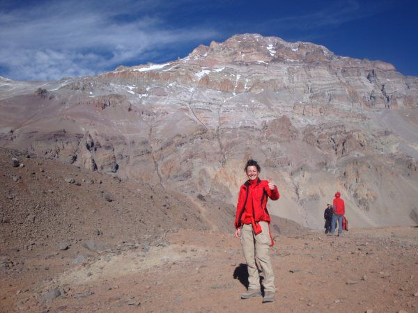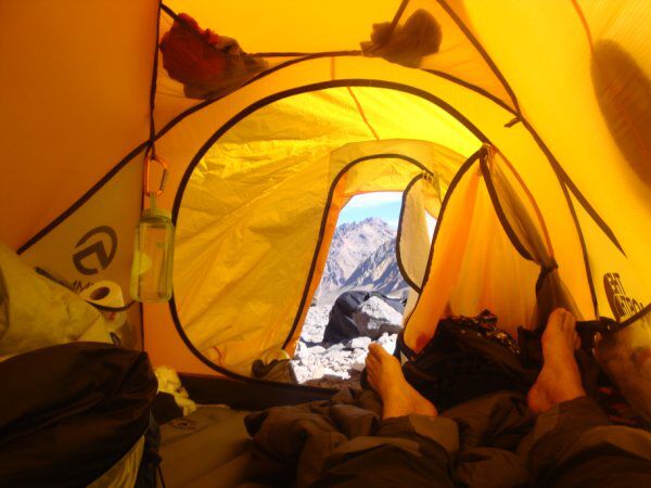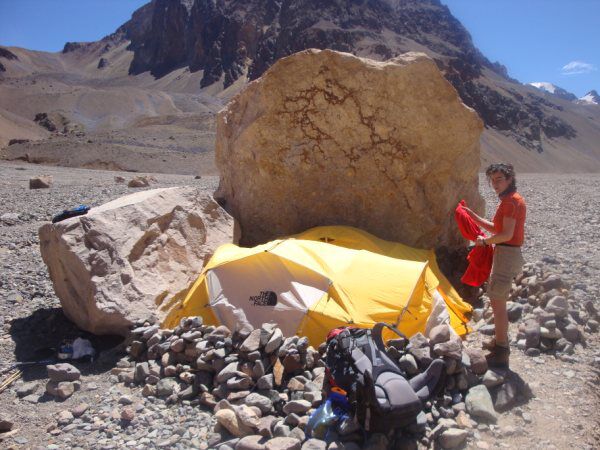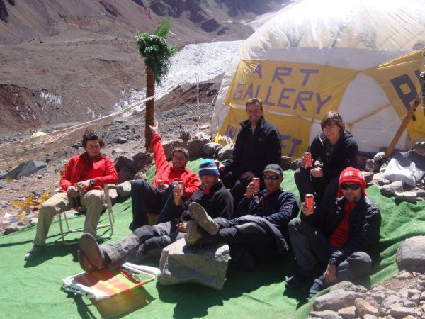 Let vooral op de palmboom en het groen wuivende gras van ons Caraïbisch eiland. De tent erachter behoort aan de hoogste kunstenaar van de wereld, die schilderijen maakt van de Aconcagua en van naakte vrouwen. Buiten een blote poep van één of andere klimmer die zijn behoefte moest doen, hebben we daar wel geen naaktmodellen gezien..