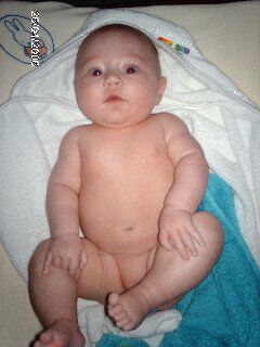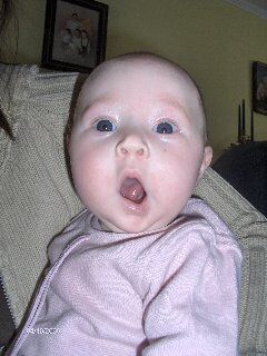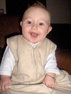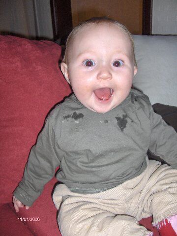 Ik heb je vandaag gezien en je kan 'dada' zeggen!! Je mama zei dat het vanaf vandaag was dat je dat kon! Ik heb je vrijdag ook gezien en toen zei je precies 'papa' maar dat was niet zo duidelijk als 'dada'. Het is leuk om het je te zien zeggen! En nu nog leren kruipen he! Je probeert het een beetje maar het lukt nog niet echt. Je kan wel niet meer stilzitten en je wil de hele tijd rechtstaan!