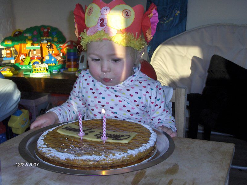 Vandaag zijn we bij jou gekomen voor je verjaardag! Je hebt flink je kaarsjes uitgeblazen, helemaal alleen! Je kroon wou je eventjes opzetten maar niet te lang. Je vond de taart ook heel lekker, zelfs de marsepein die er op lag vond je lekker. Ik heb jou een keukentje kado gedaan en je begon het al direct in elkaar te steken, heel flink! Je hebt ook je mama, nonkel Korneel en mij thee gegeven of toch 'zogezegd', het was wel grappig om te zien! Ook je nonkel Korneel heeft je een kadootje gegeven, nog wat potjes, pannetjes, bordjes,... voor bij je keukentje! Je wordt veel te snel groot!! Maar het is ook leuk om je te zien opgroeien en je nieuwe dingen te zien leren!