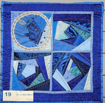 Ivet Bonte won met haar prachtige quilt "Crazy Blue Moon" de tweede publieksprijs in de wedstrijd uitgeschreven door naaimachinehandel Van Rooy in Mechelen!