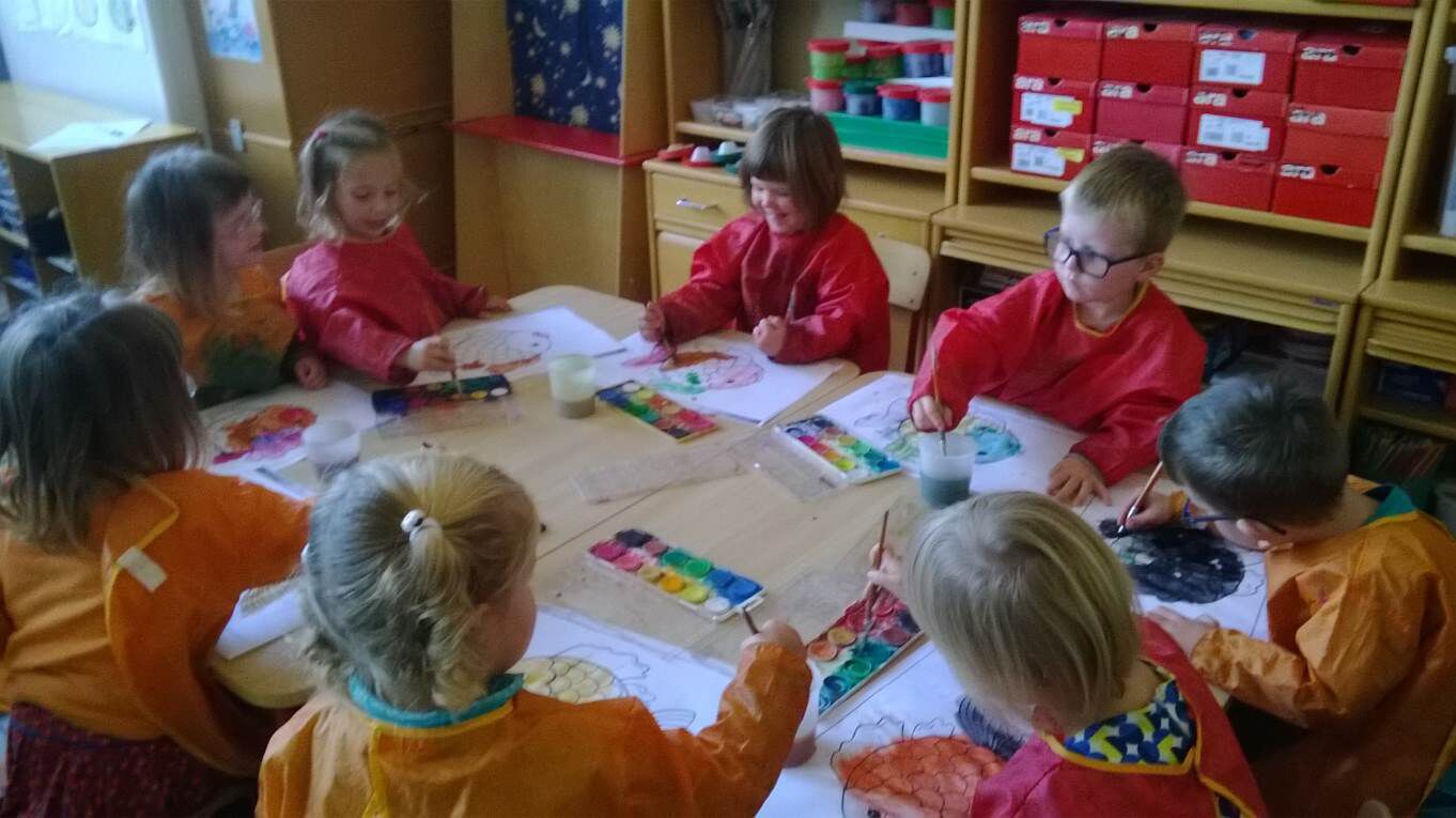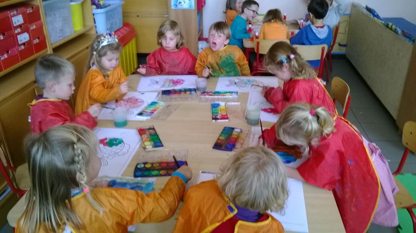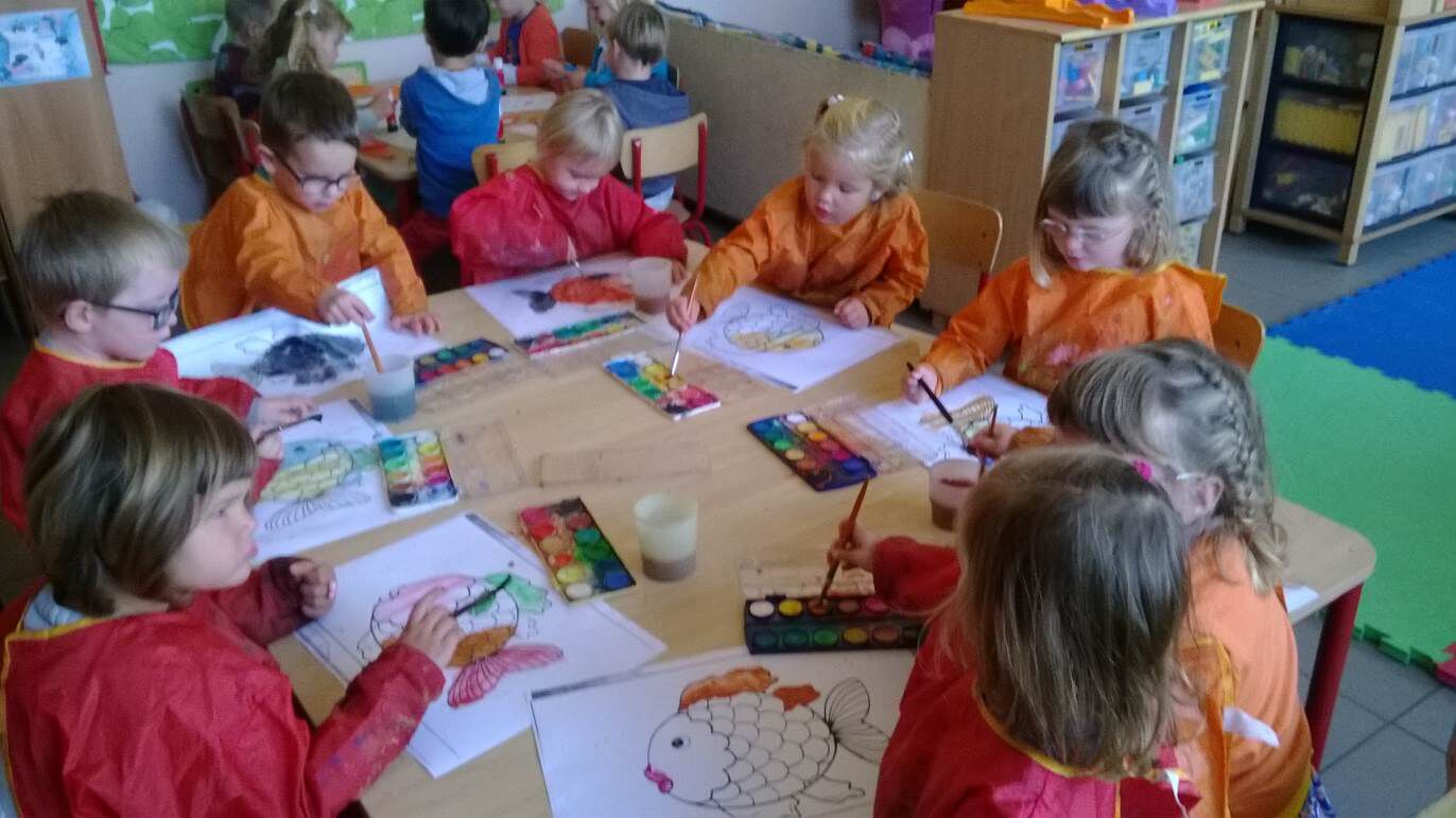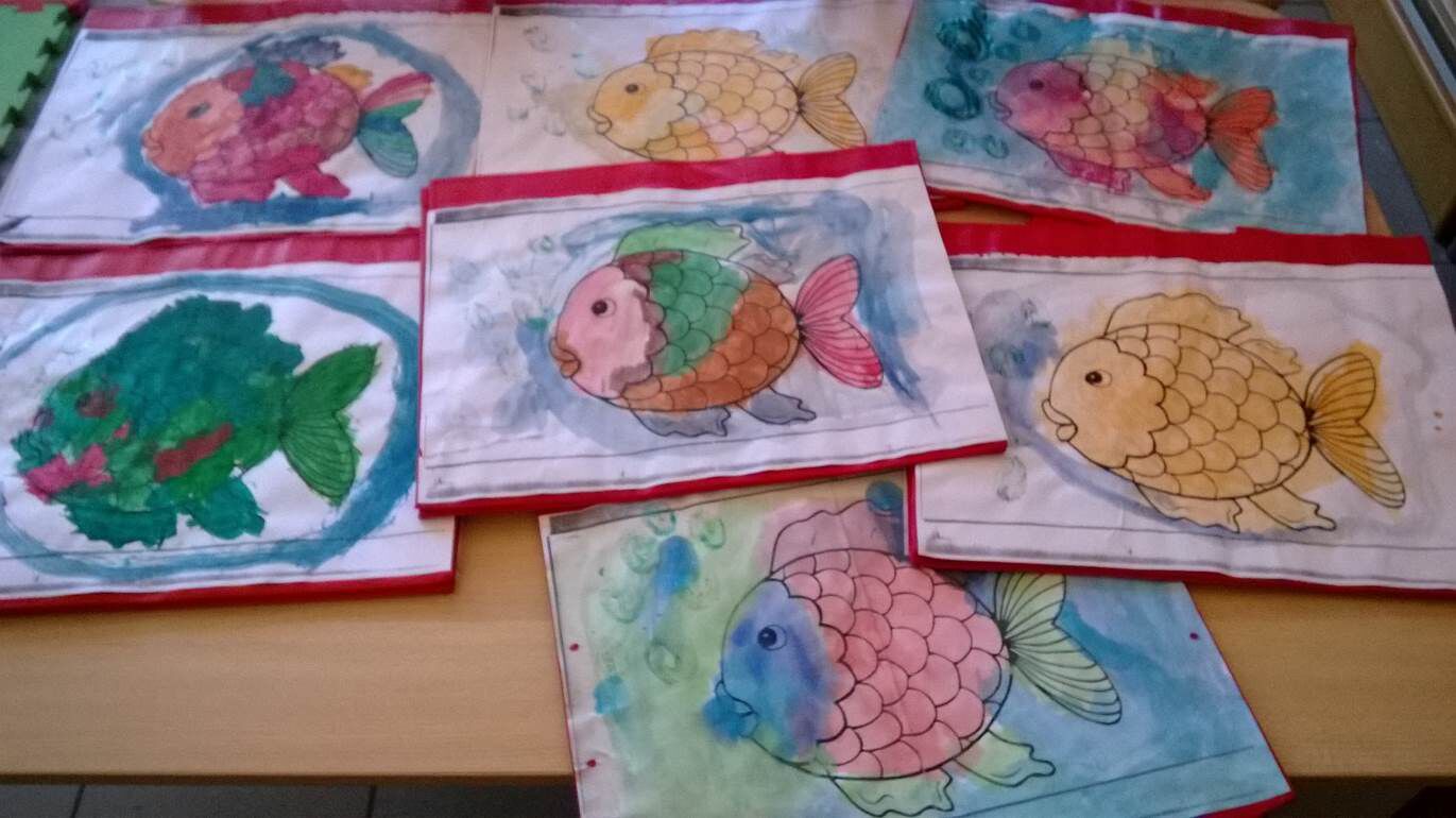 Wo: techniek / Muz: Beeld : aan de hand van een stappenplan een regenboogvisje schilderen. De kleuters volgen de prenten.