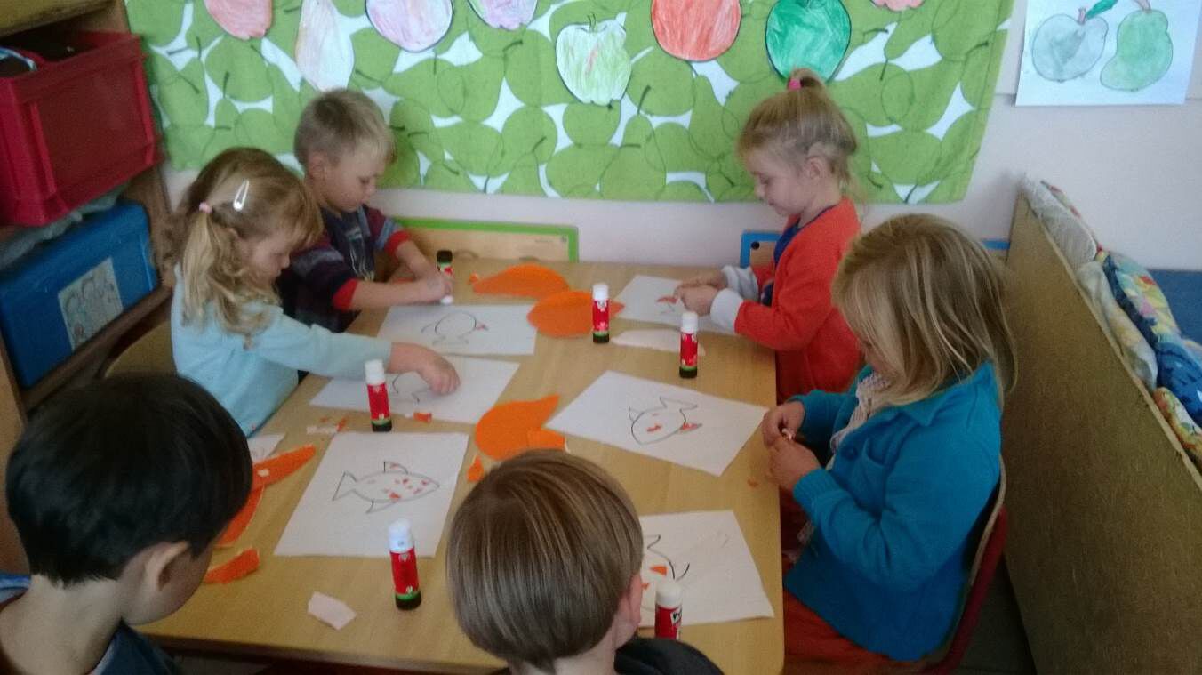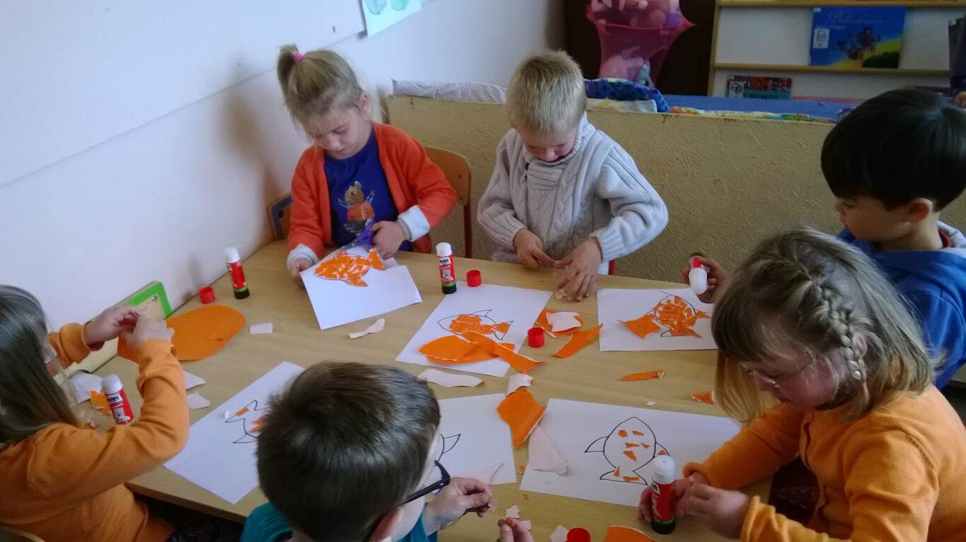 Muz: beeld: techniek: scheuren, kleven en knippen : "visjes voor ons reuze aquarium".