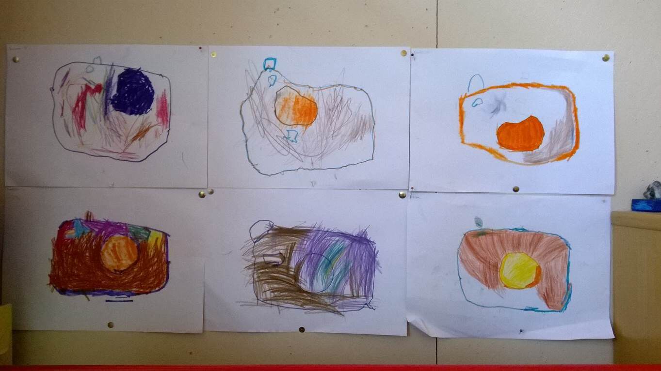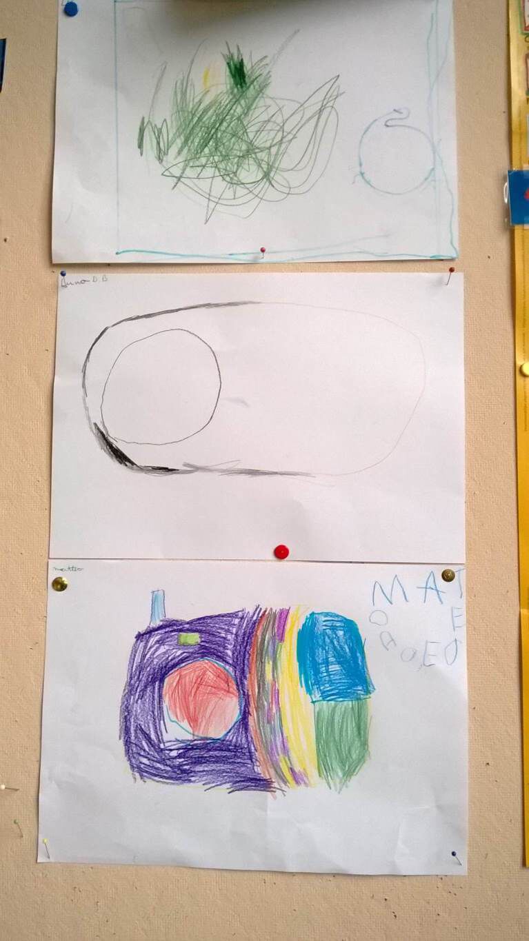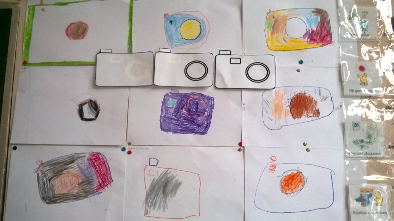 Wo: Techniek : kleuters leerden een foto te nemen met een echt fototoestel en een liedje erbij : zie hier hun eigen getrokken foto's .
