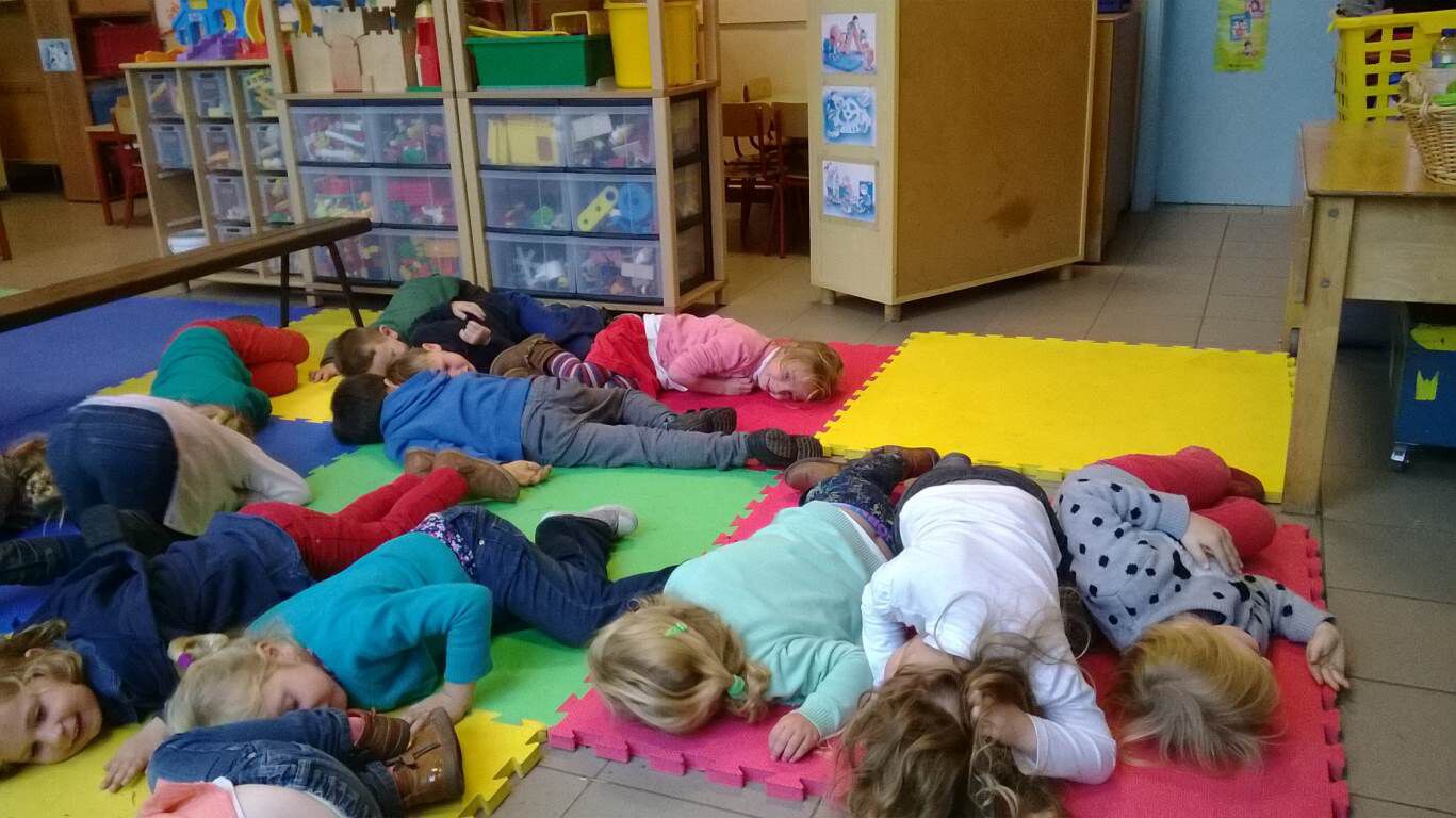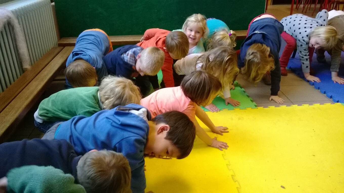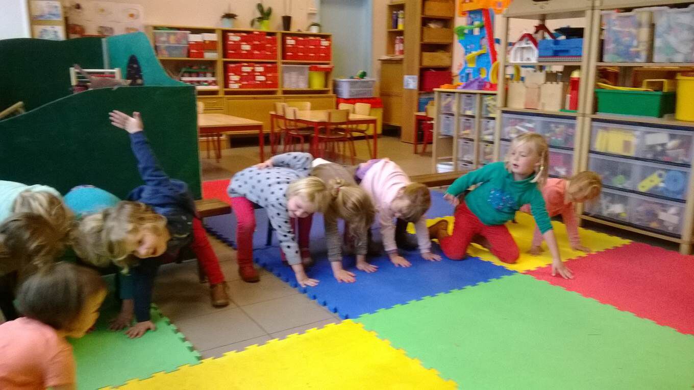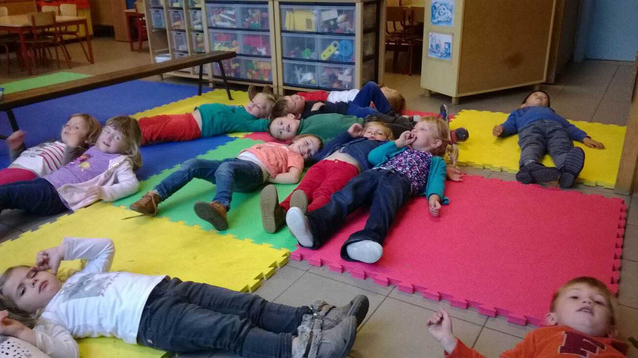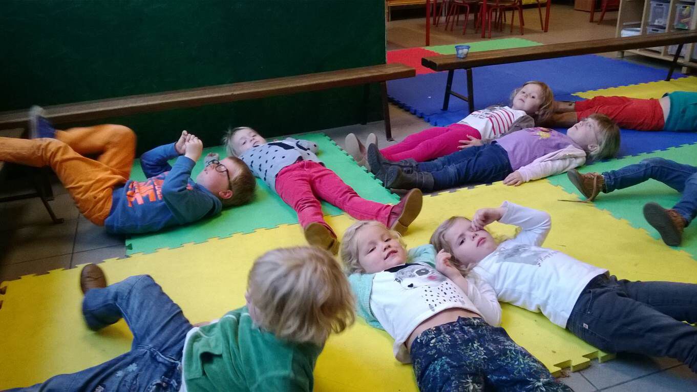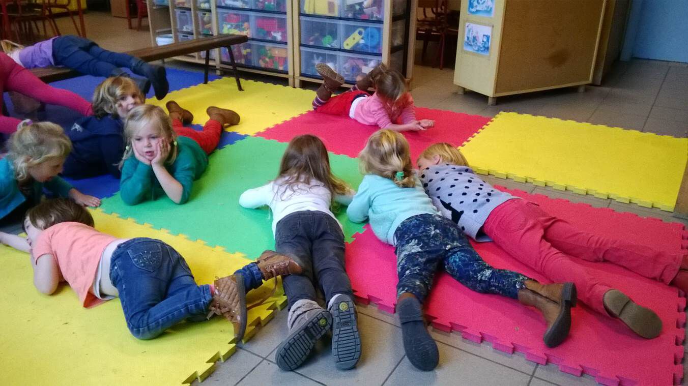 Lo: bewegingstussendoortje : vastgeplakt op de mat met een lichaamsdeel na het signaal. ( buik, rug, schouder, knie, oor.. )