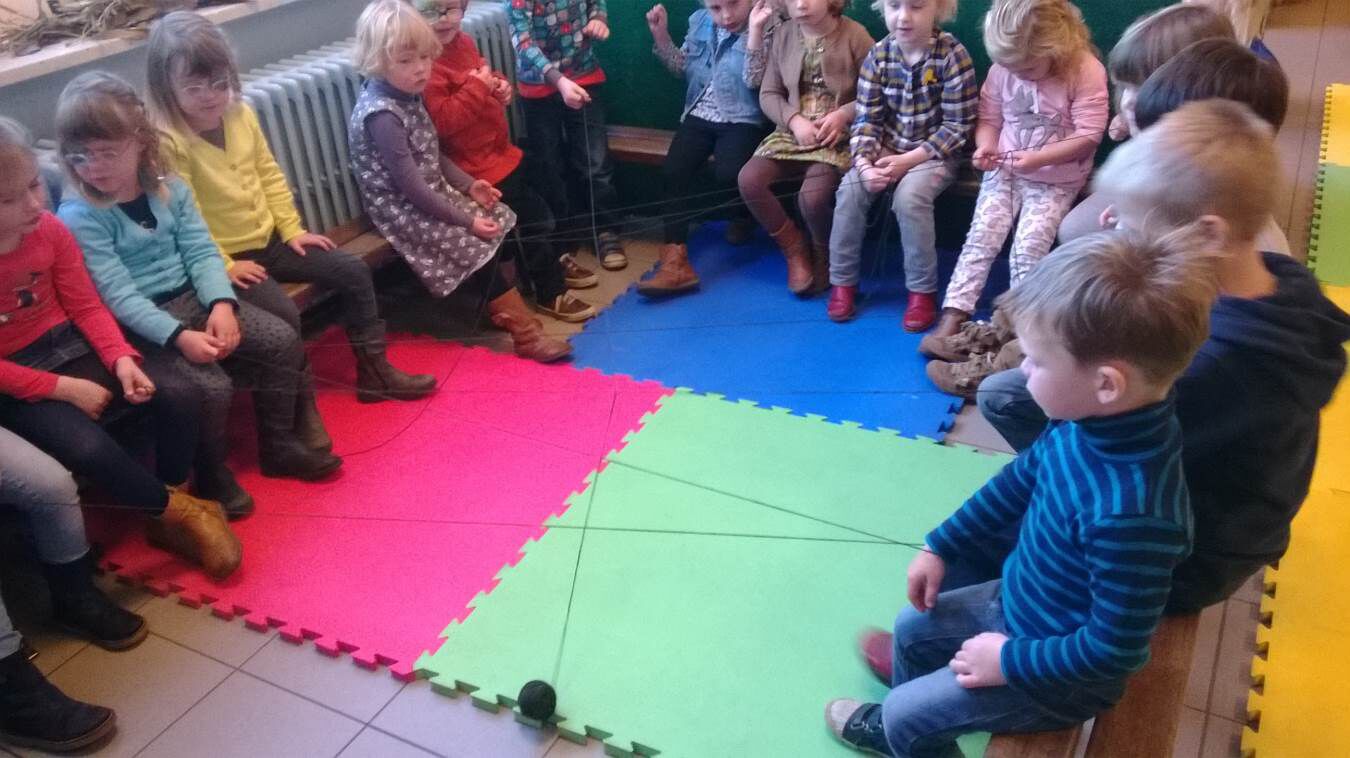 Taal : taalbeschouwing : woorden zoeken die beginnen met de letter "s" . We maken een spinnenweb met een bolletje wol en zoeken een woordje als we het bolletje krijgen.  De kleuters vonden heel wat woorden : slak, sap, soep, spin, slik, ... goed zo!!