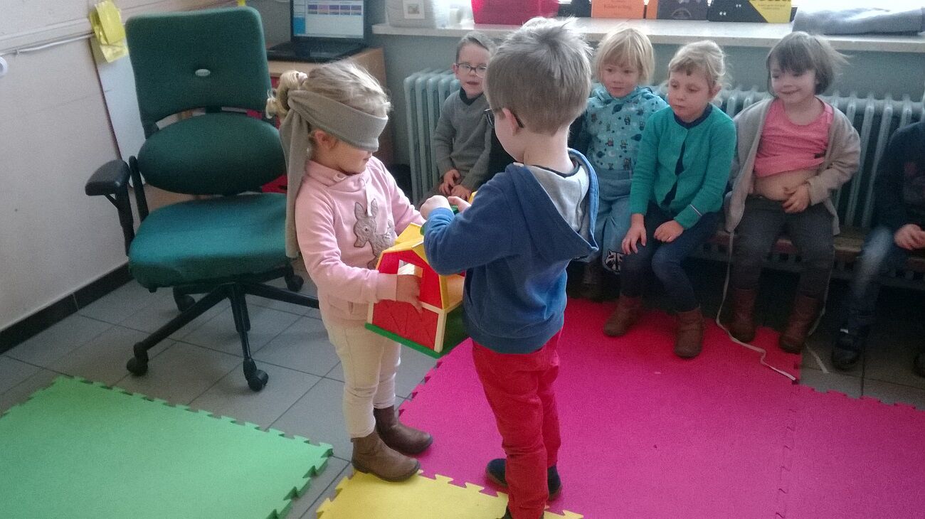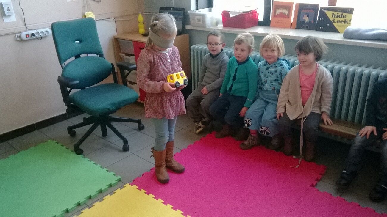 Lo/WO: tussendoortje techniek : kleuters verstoppen kleine spulletjes uit de klas voor elkaar in de piep-piep doos. Een andere kleuter moet raden en proberen details herkennen met de zaklamp.