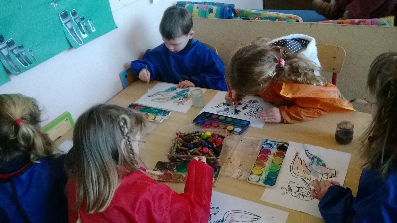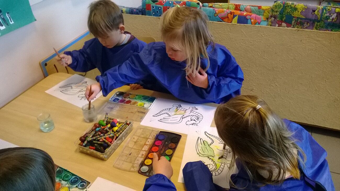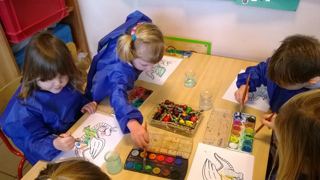 Muz: beeld : draak inschilderen met waterverf en met wasco vlekken tekenen