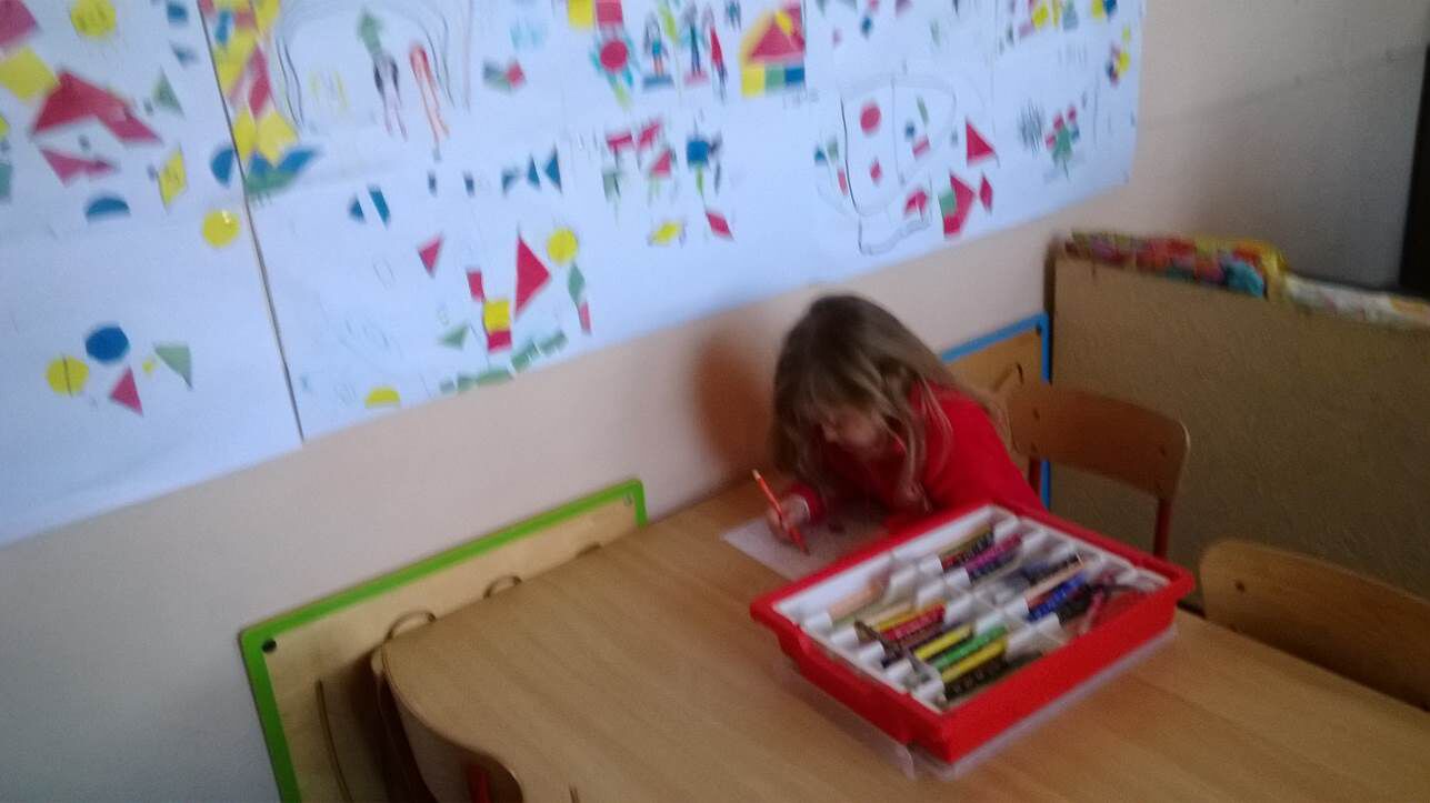 Muz: beeld: Liselotje kleuren en stempelen ( bloed ) en verzorgen ( verbandjes knippen en kleven )