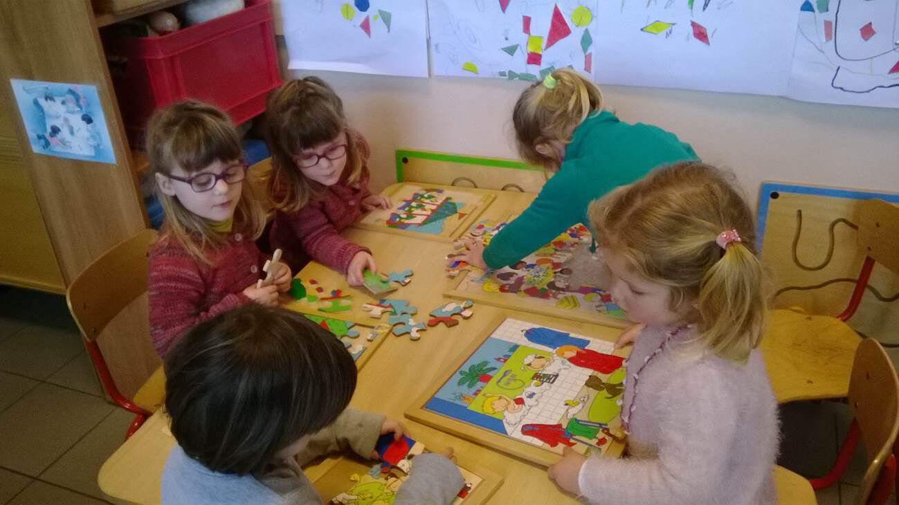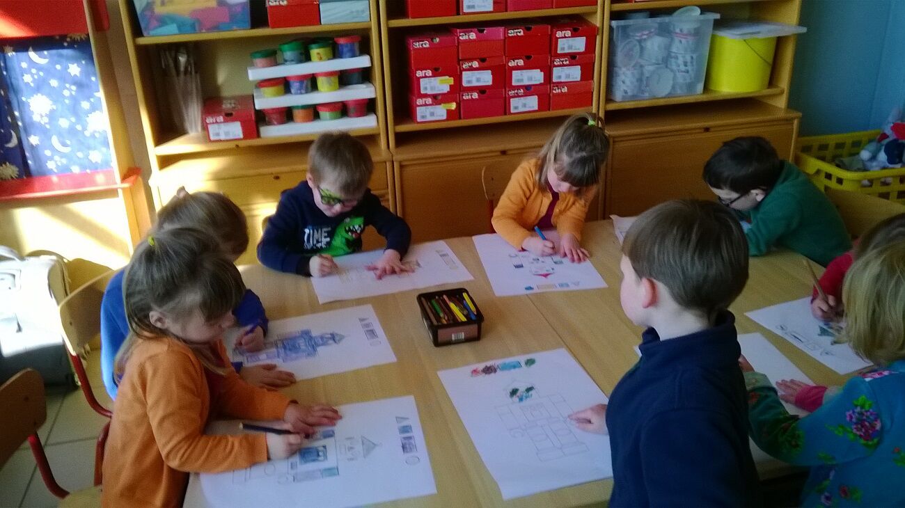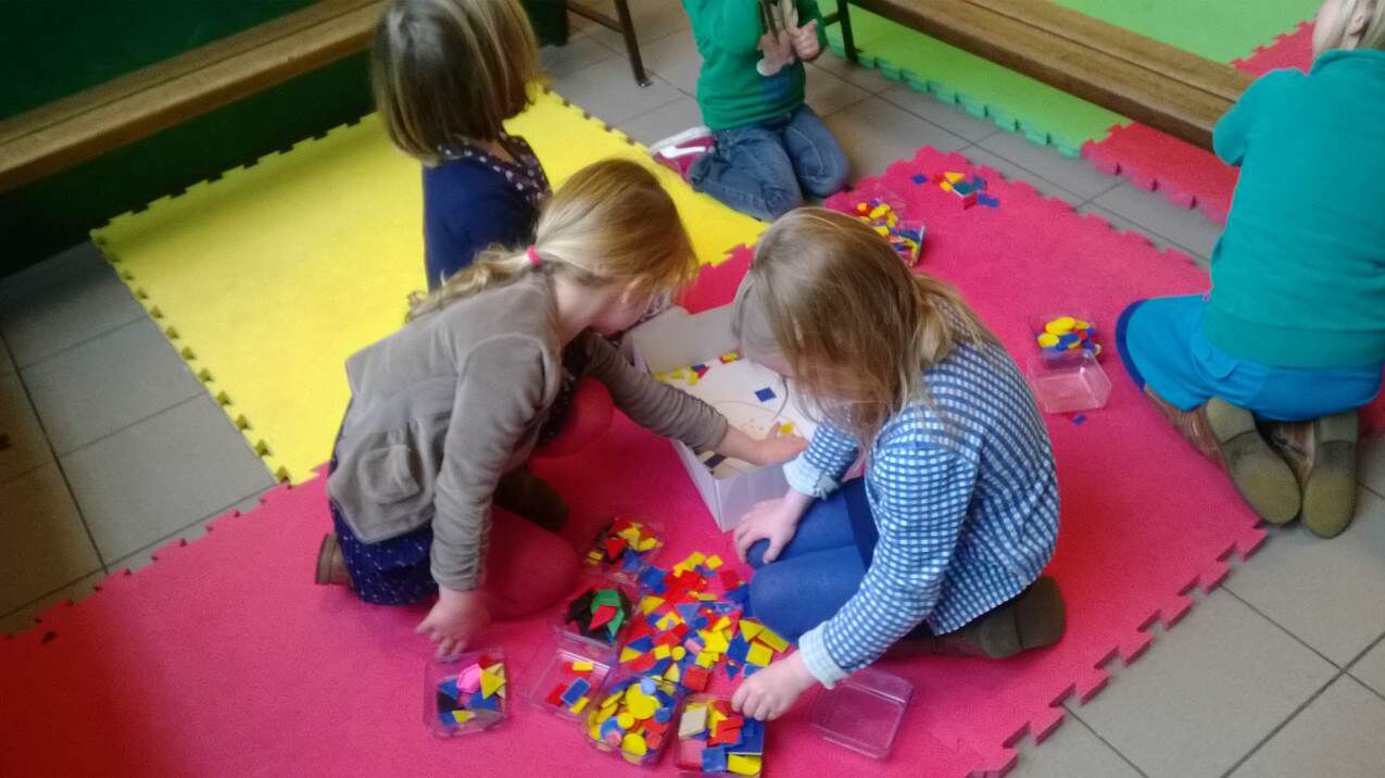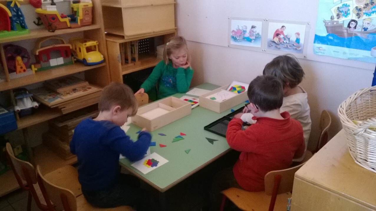 Wisk: meetk: vormenspellen: sorteren van vormpjes op kleur en vorm, tanggram, figurama.