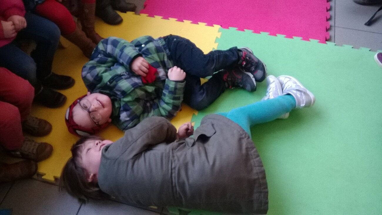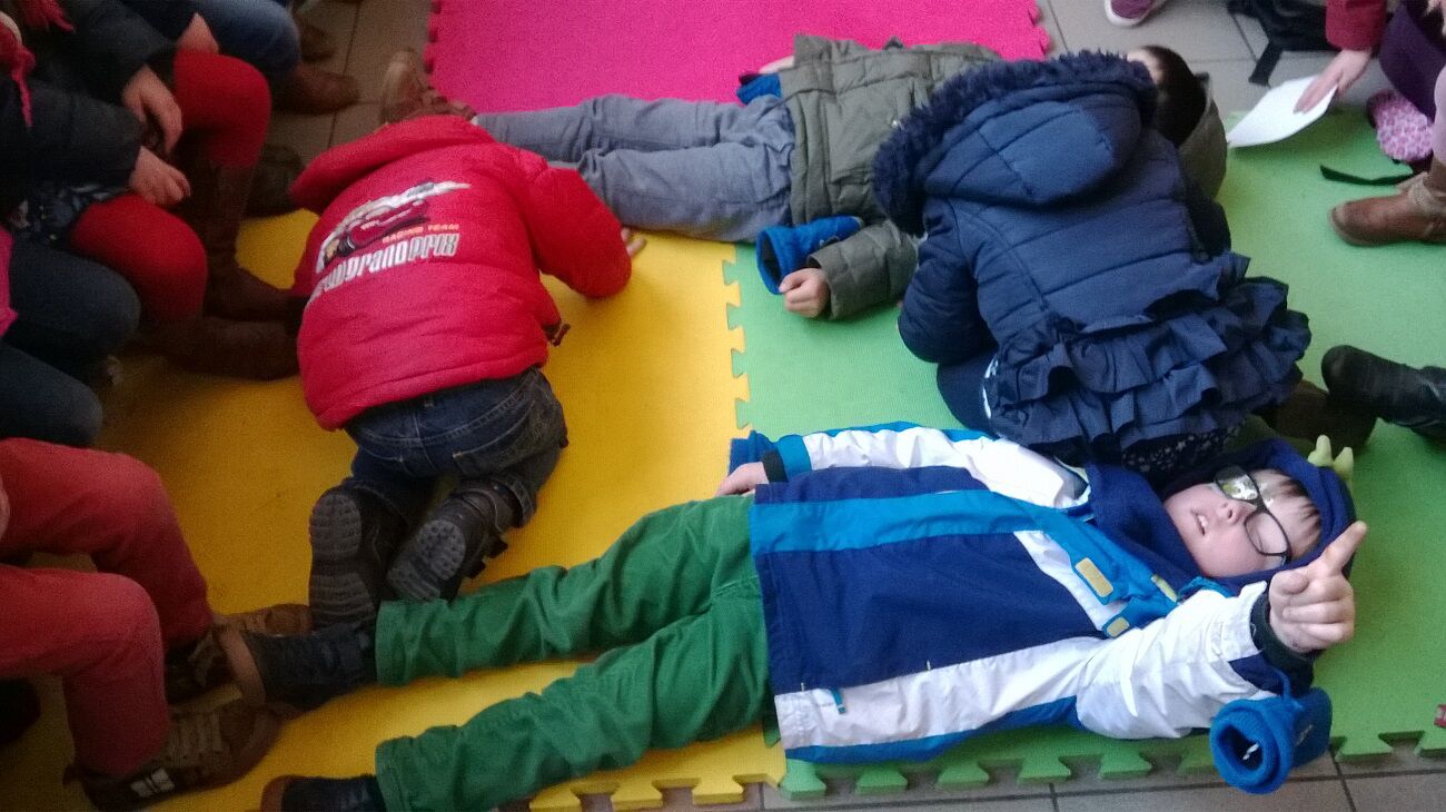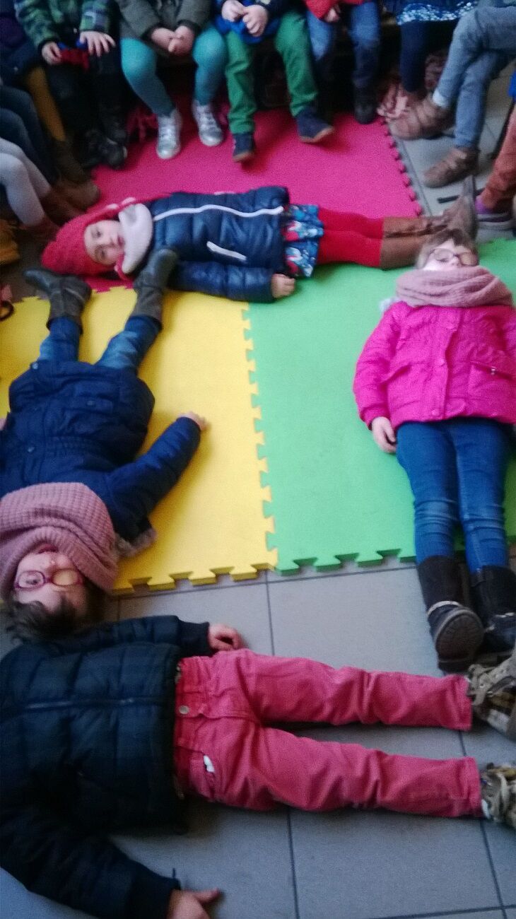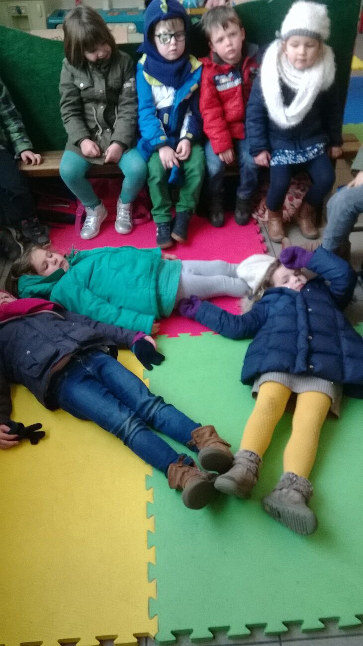 Lo: bewegingsspelletje: ruimte: kleuters leggen samen vormen na op de mat. ( vierkant, rechthoek, cirkel, driehoek )