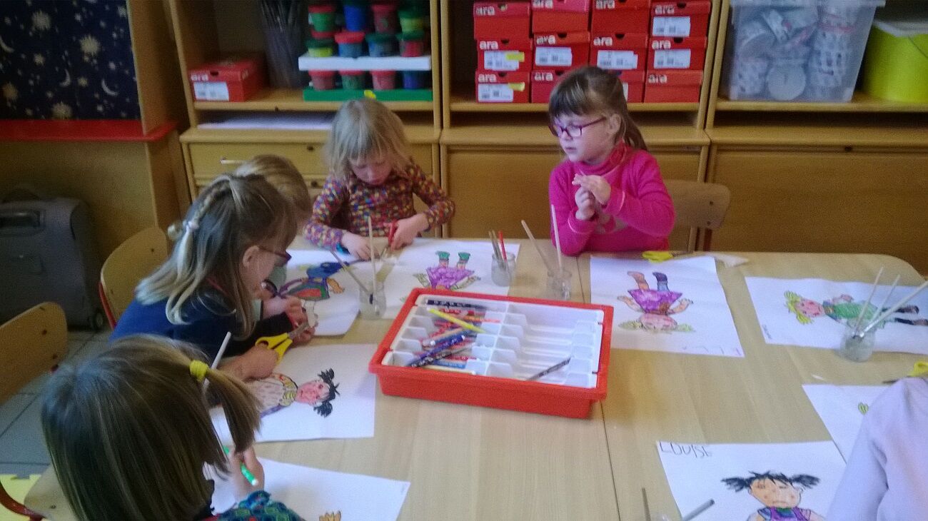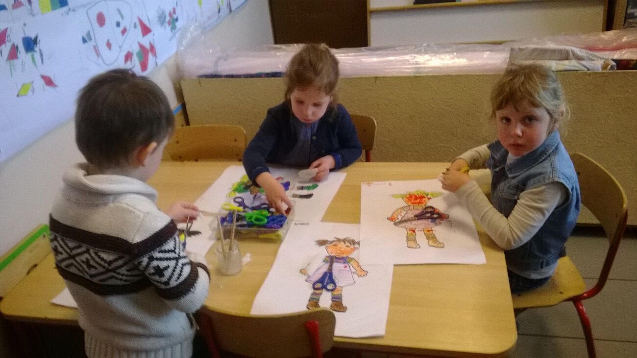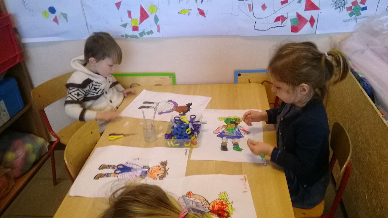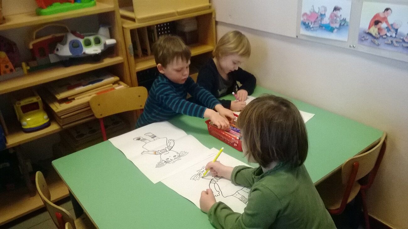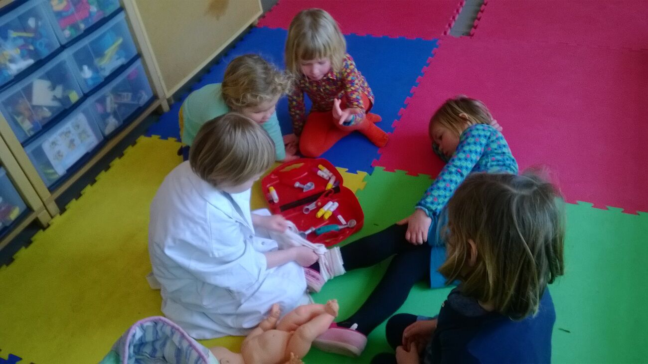 Muz: beeld: Liselotje kleuren en stempelen ( bloed ) en verzorgen ( verbandjes knippen en kleven )