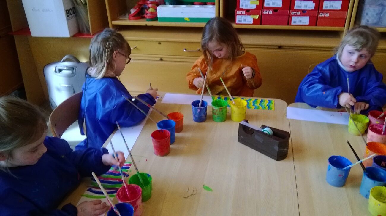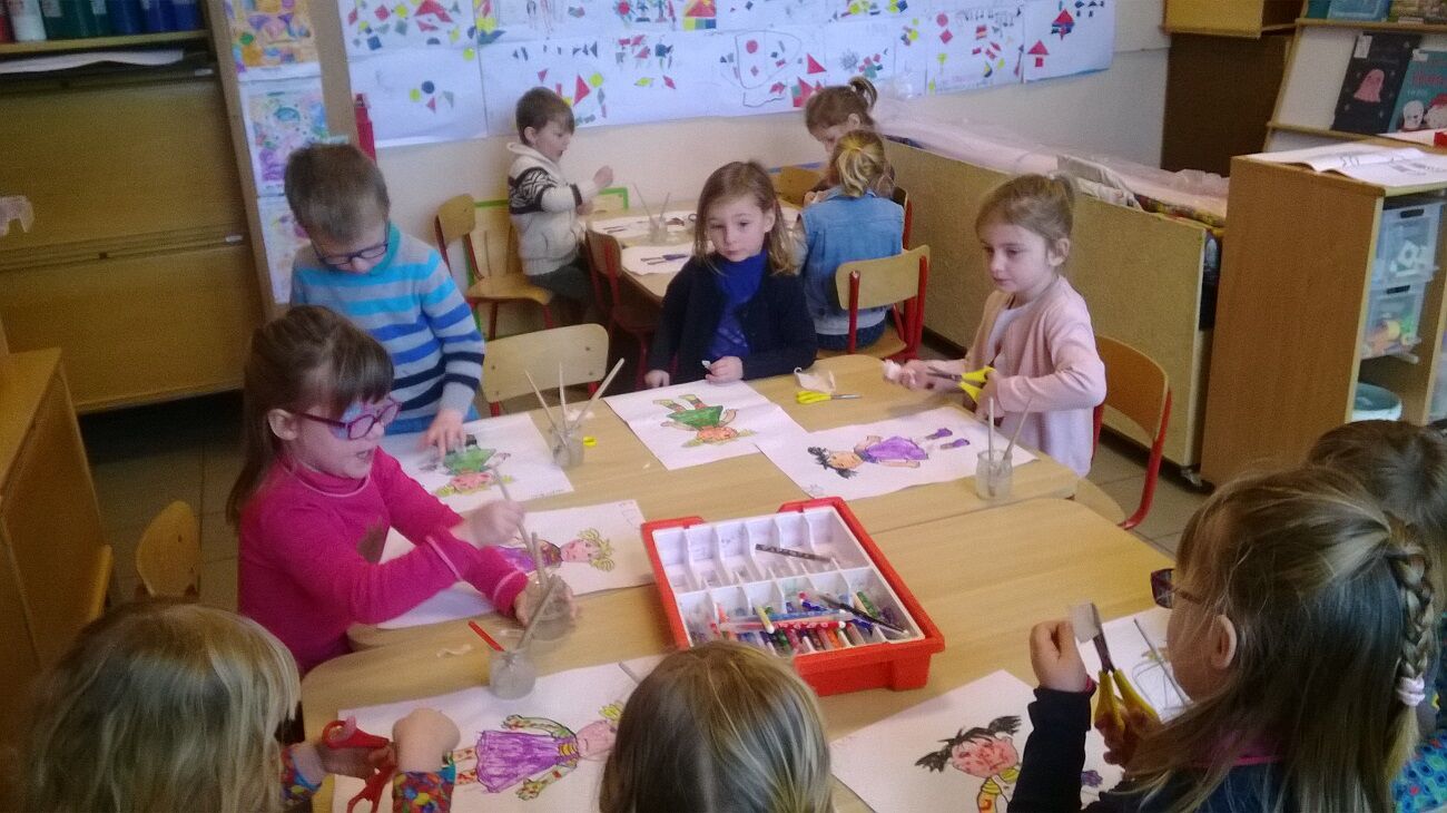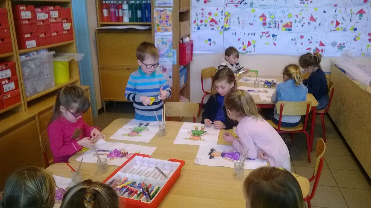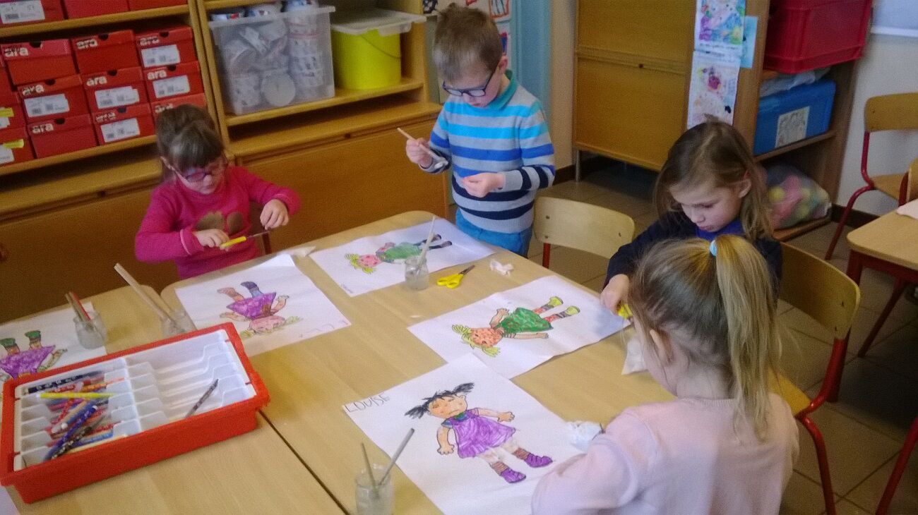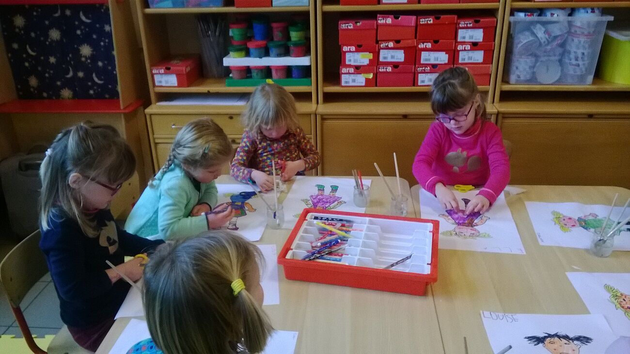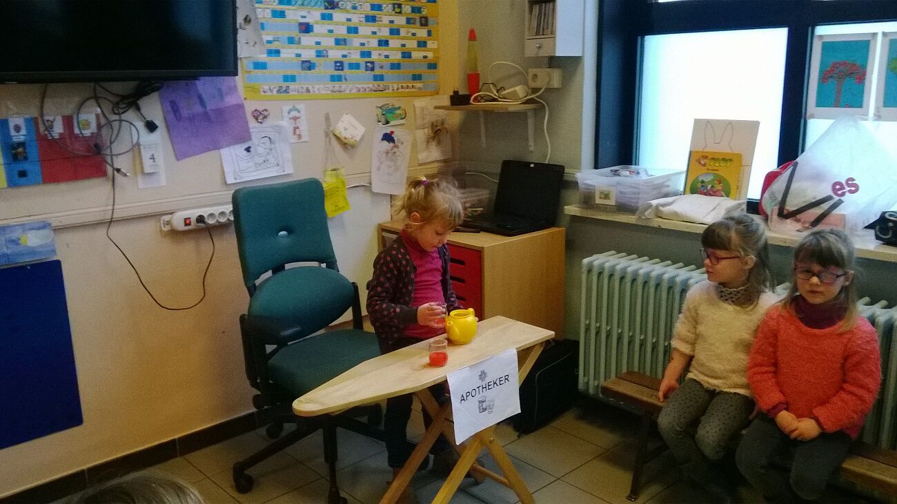 Muz: beeld: Liselotje kleuren en stempelen ( bloed ) en verzorgen ( verbandjes knippen en kleven )