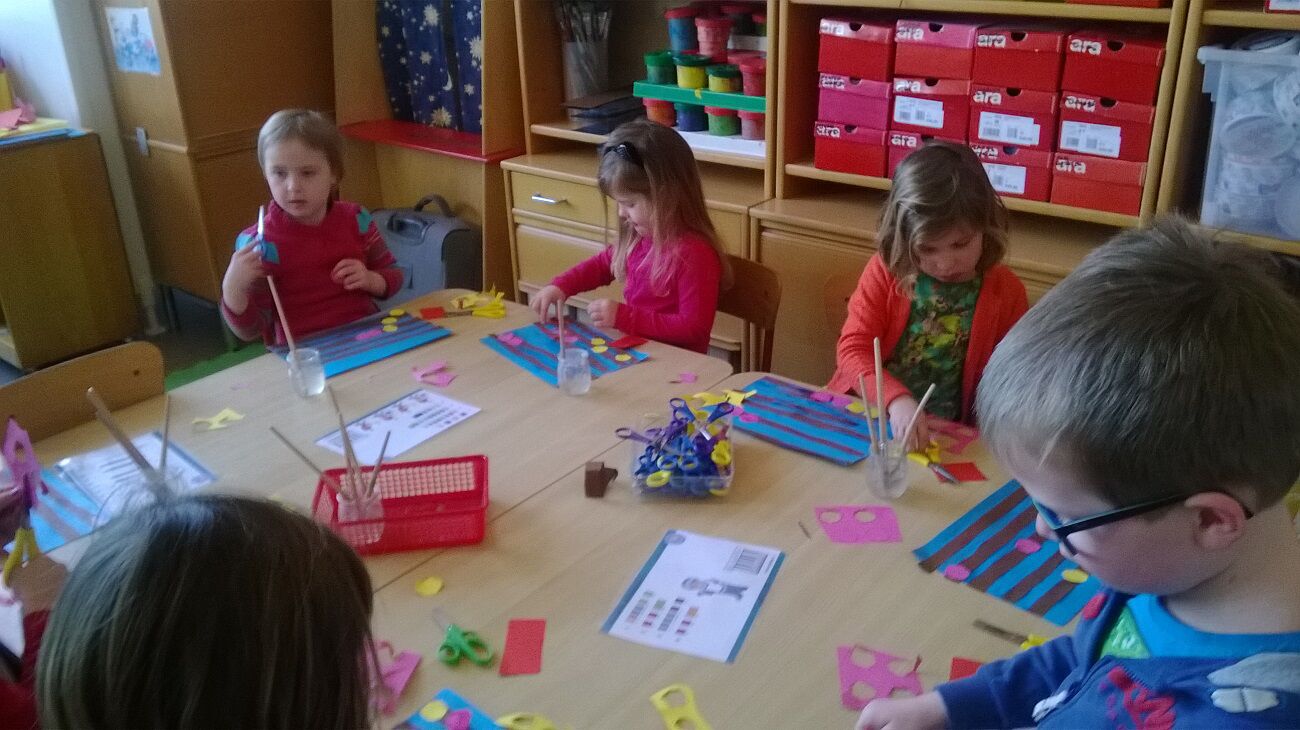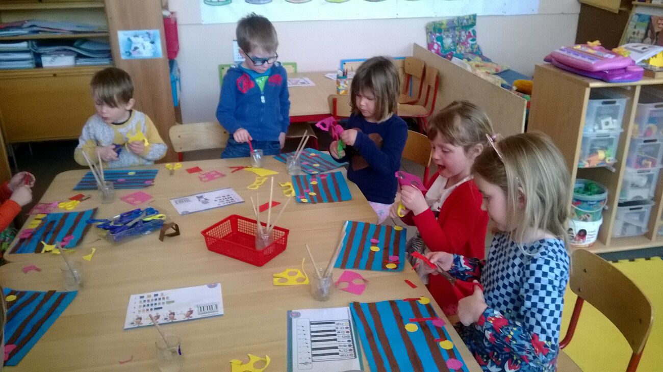 Taal : schrijven : eitjes versieren met lijntjes , stipjes en krulletjes , een mandje knippen voor er rond.