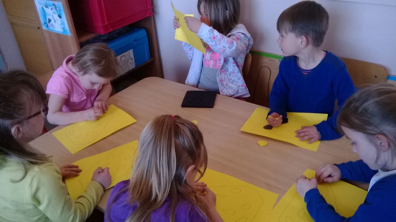 Muz: beeld: affiches maken schoolfeest : bloesems stempelen en blaadjes knippen
