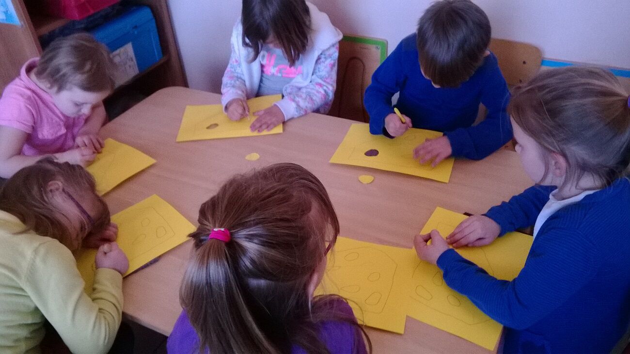 Muz: beeld: prikken en knippen : kaasblok en muis die gaasjes bijt.
