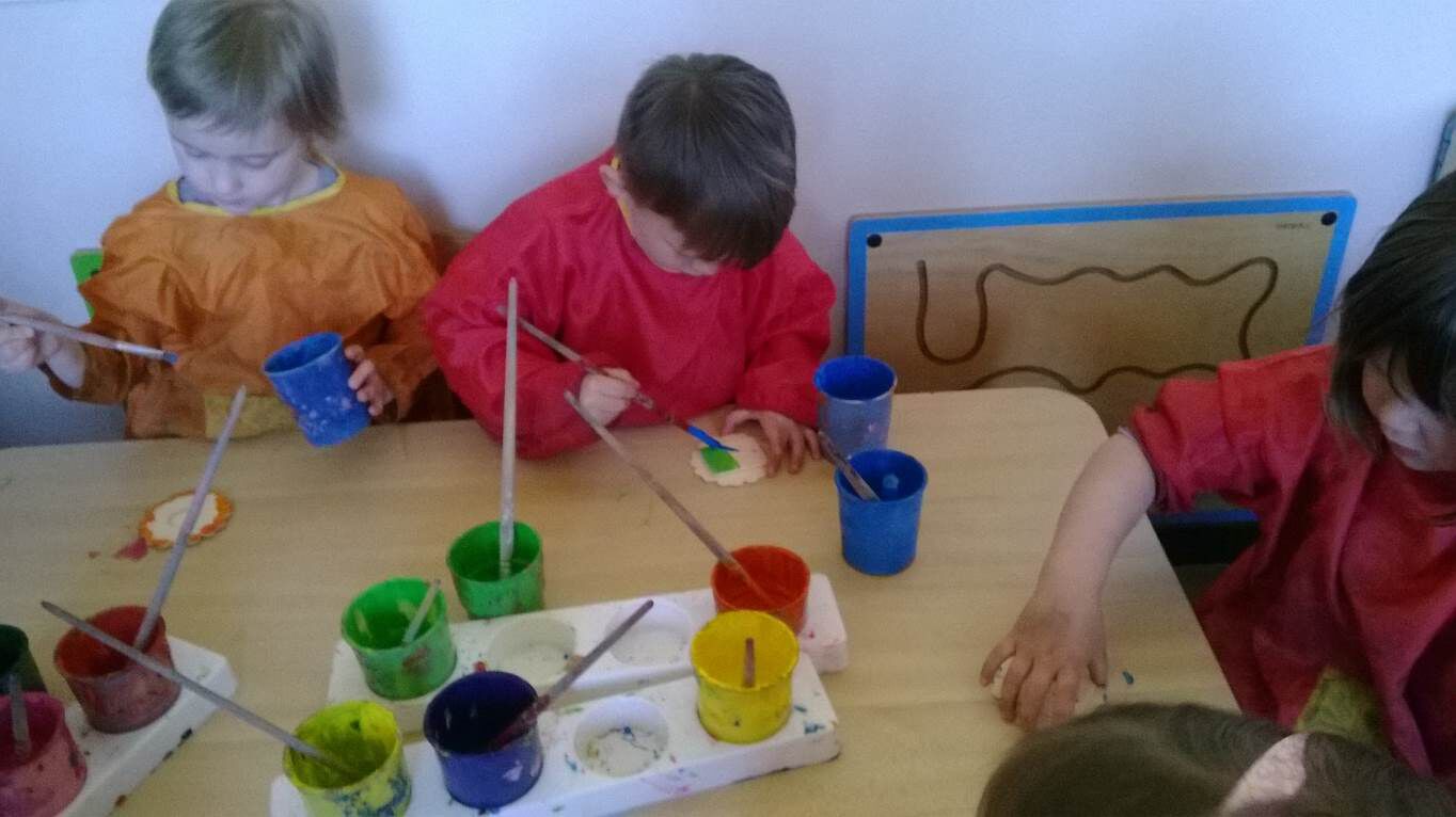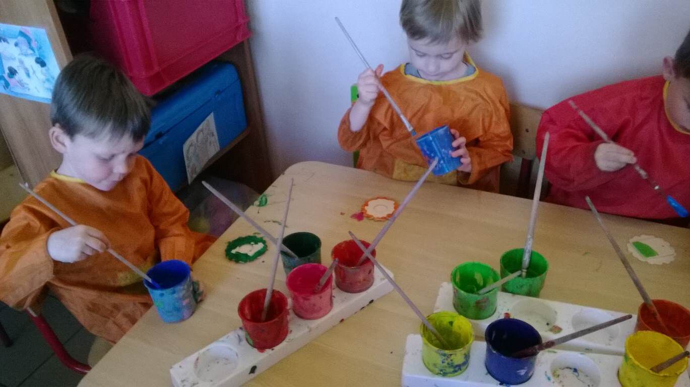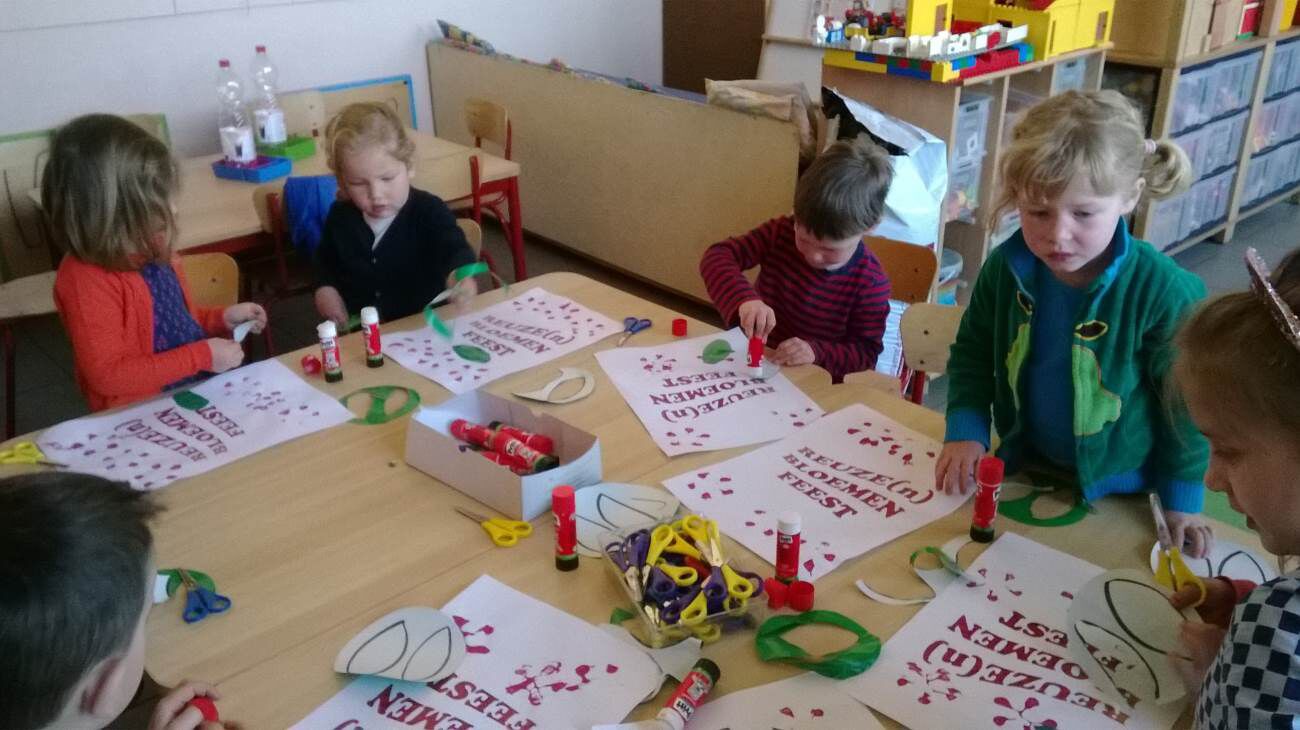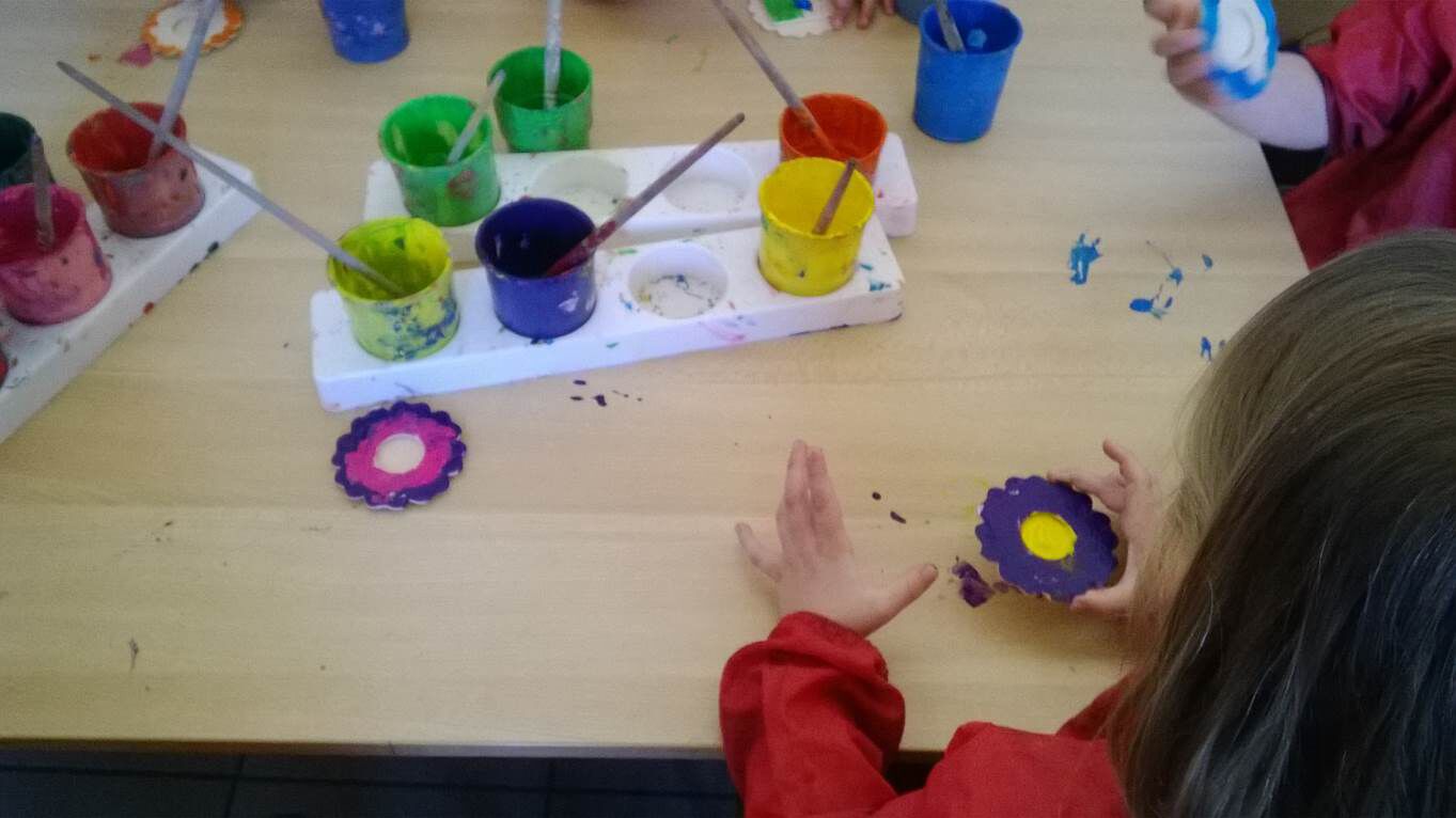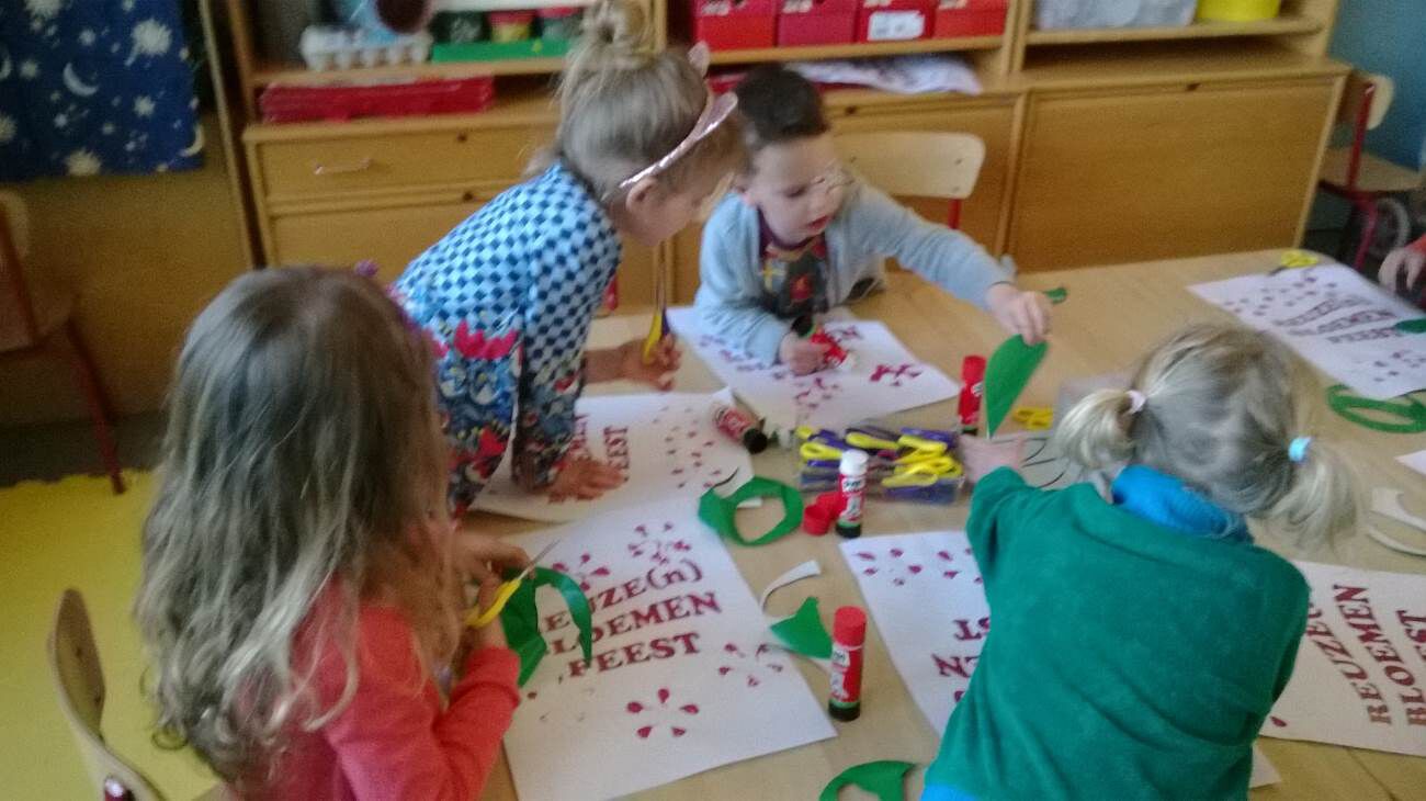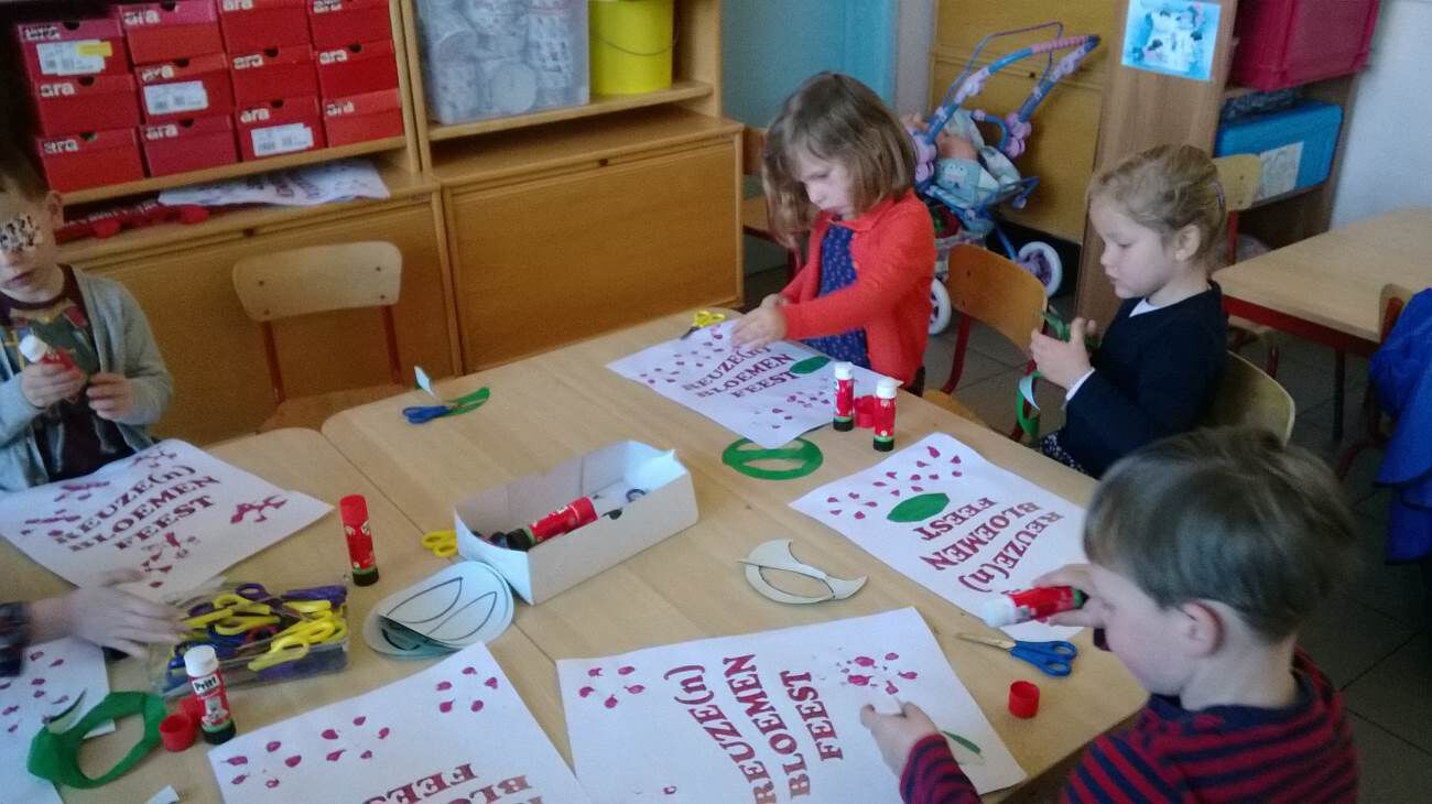 Muz: beeld: affiches maken schoolfeest : bloesems stempelen en blaadjes knippen