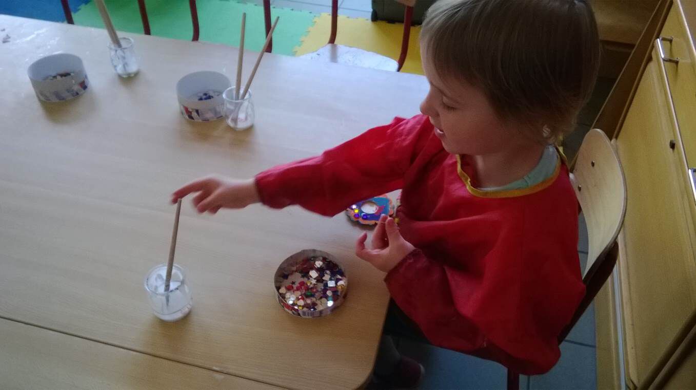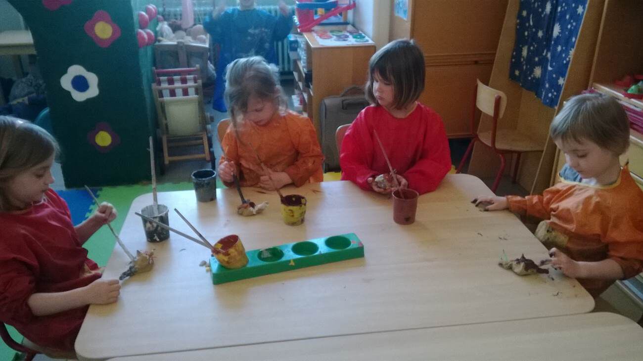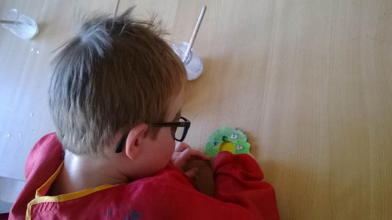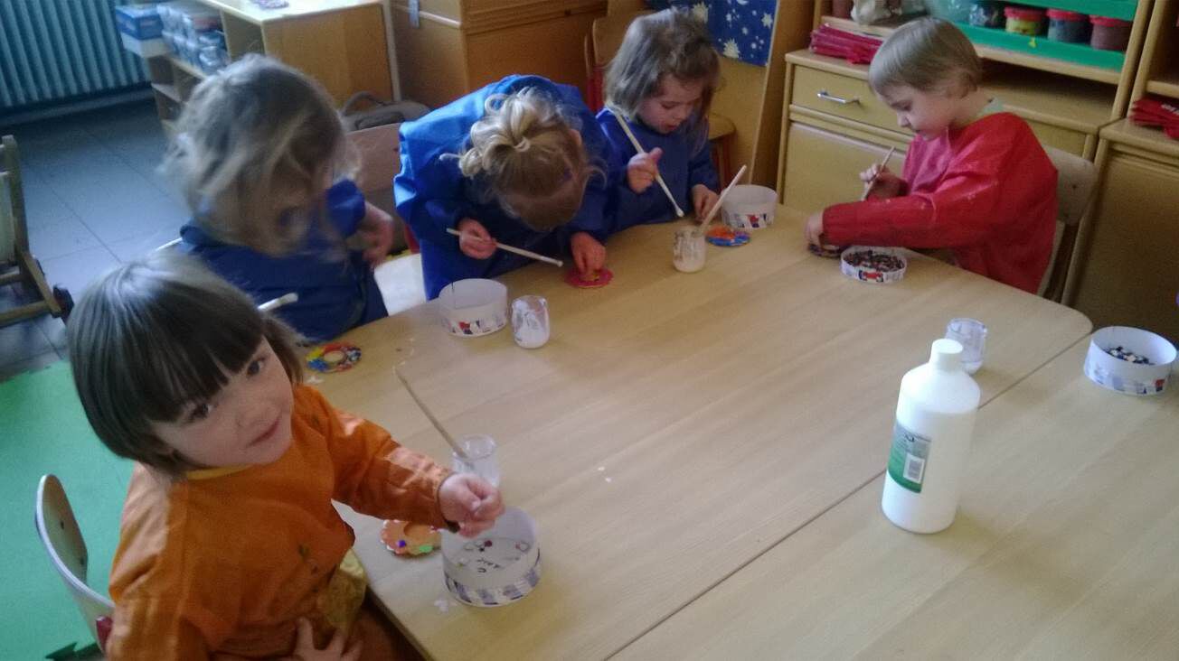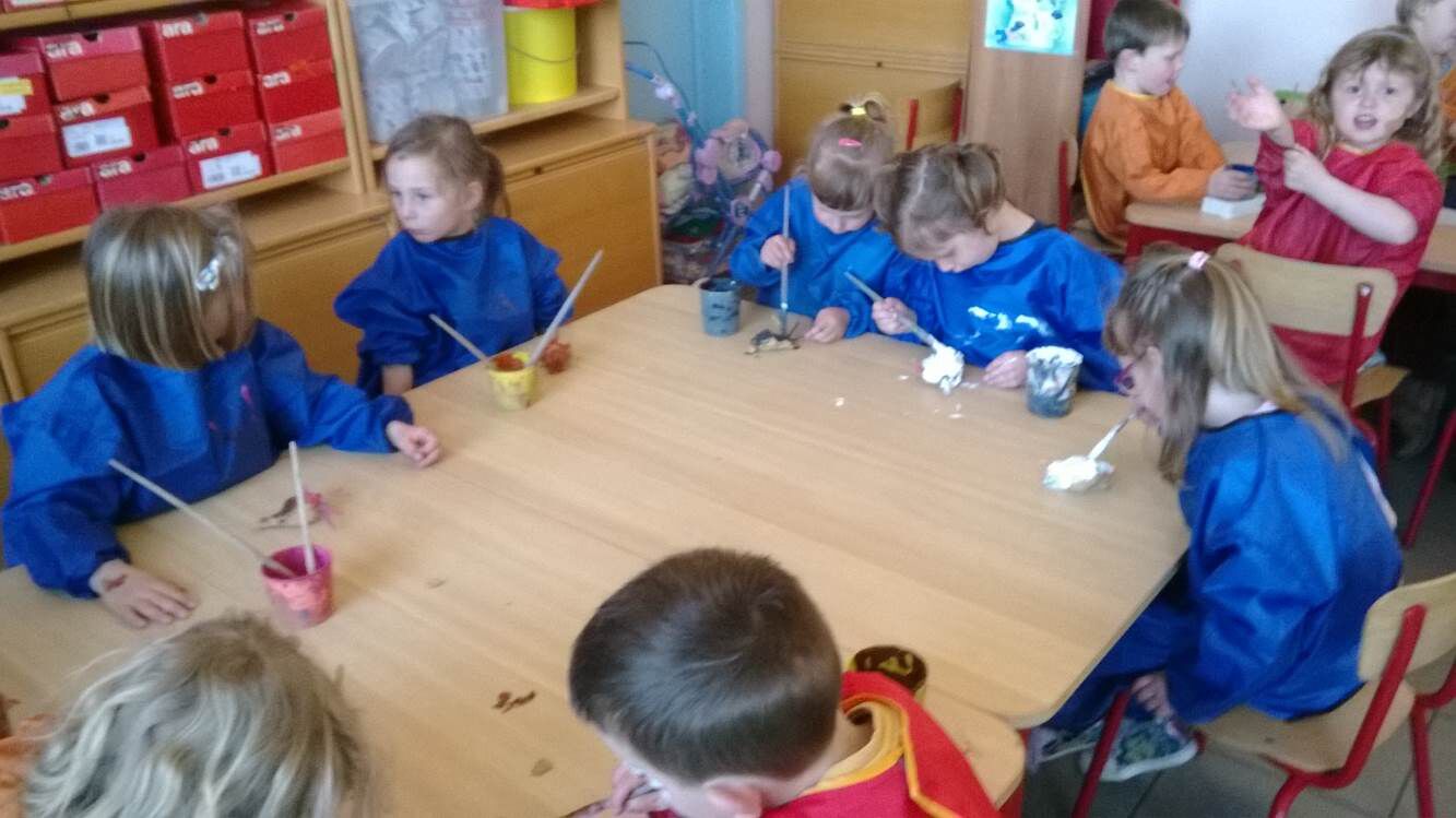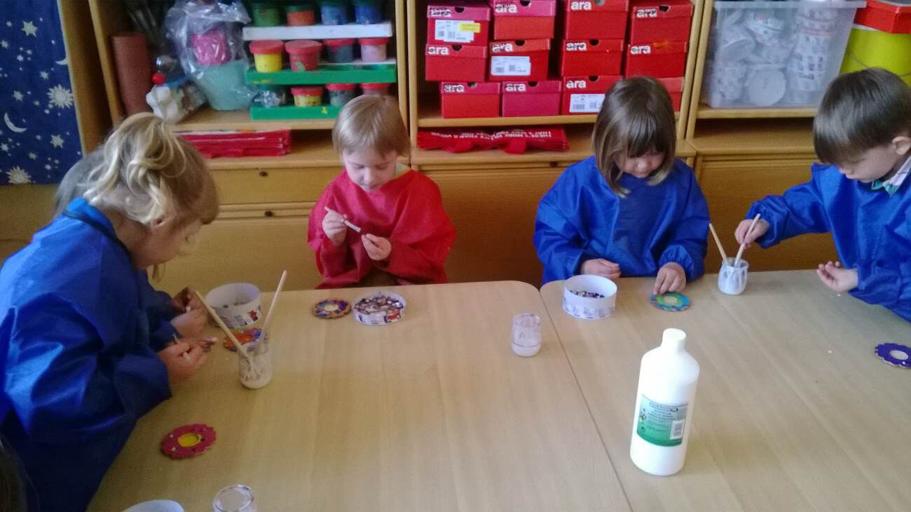 Muz: beeld: affiches maken schoolfeest : bloesems stempelen en blaadjes knippen