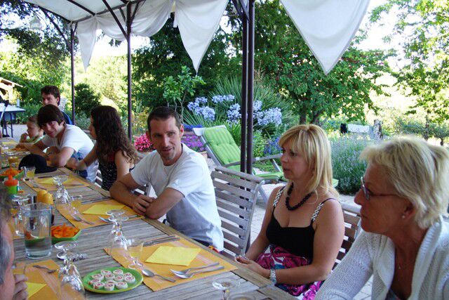 Iedereen samen tijdens de table d'hôtes: Nadine & Dirk, Peggy & Corina, Lilianne & Jean-Paul.