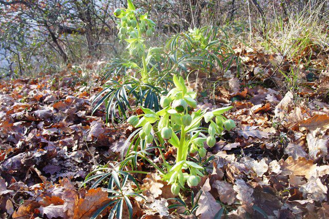 De Helleborussen staan hier in de bossen weer volop in bloei. Het zijn prachtige bloemen en zeker ook deze wilde soort is de moeite waard. De frisgroene bloemen vallen echt op tussen alle dorre bladeren en kale struiken.