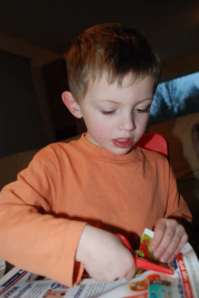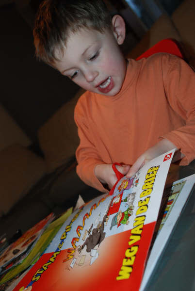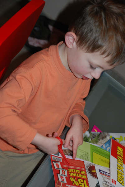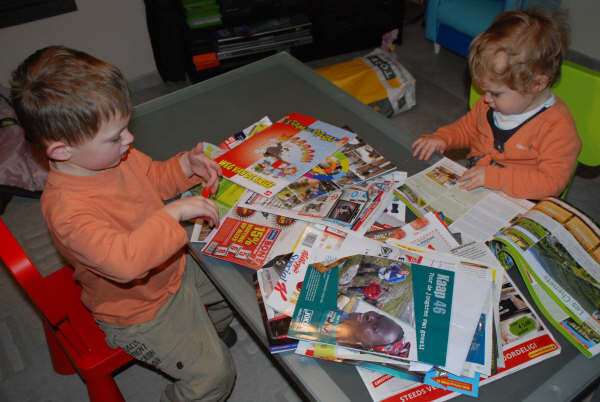 Dus wij alle reclamefolder, wintercatalogussen op tafel gegooid en zoeken en knippen!
