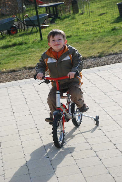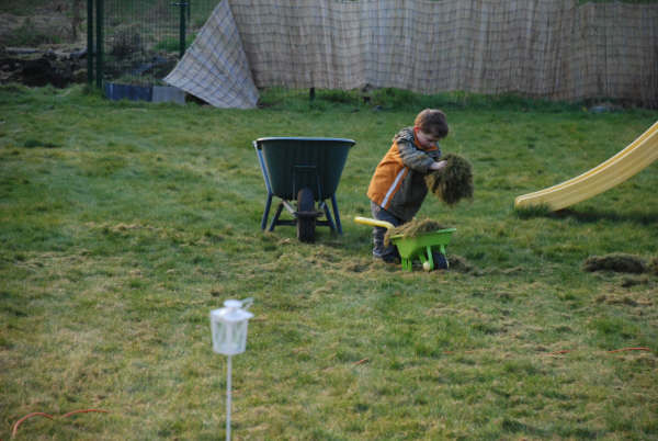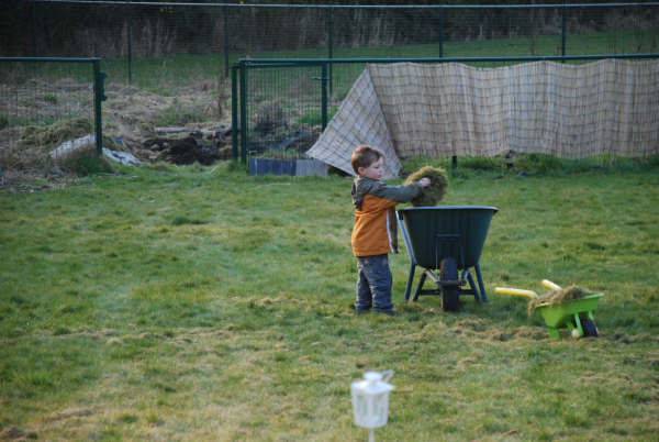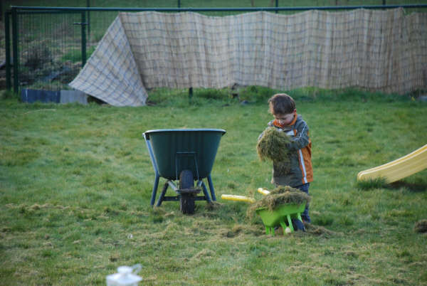 Hij heeft zelf gevraagd om te helpen en uiteindelijk zelf gevraagd voor zijn kruiwagen want hij wou hetzelfde als mama.