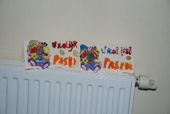 En door het slechte weer waren de Paashaas en de klokken binnen gekomen... AMAI!!! wat waren die tekeer gegaan!