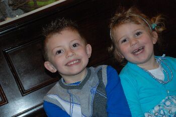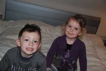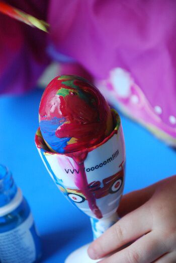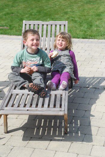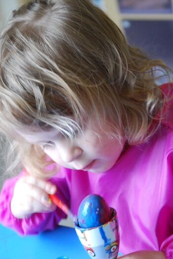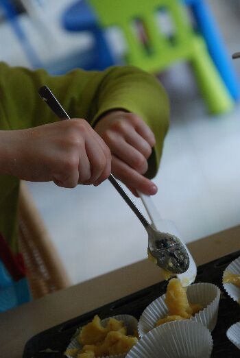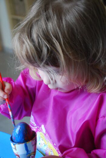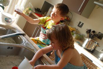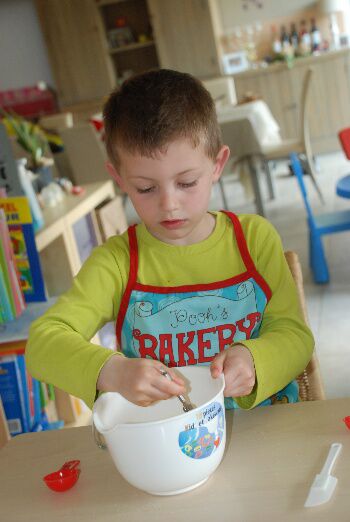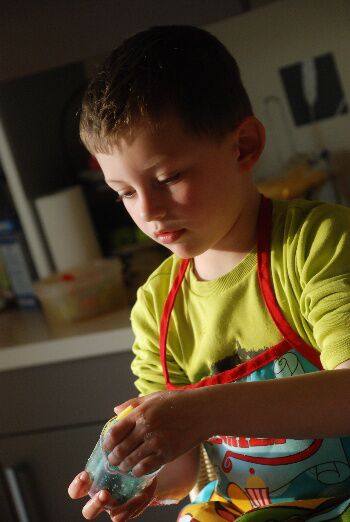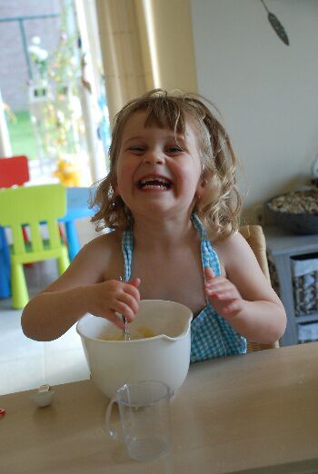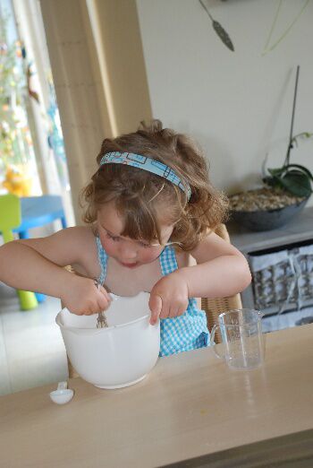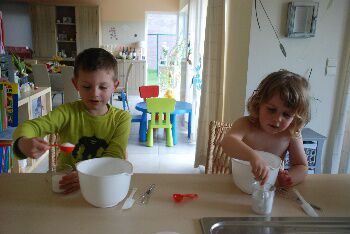 Nu de Paashaas hun een eigen bakset heeft gegeven zijn ze mijn nieuwe koks in huis. Het dessertje aan het maken voor morgen...