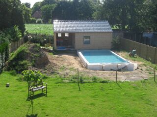 Gisterenavond laat al direct gestart met het vullen en vandaag verder gedaan. Het zwembad is nu al voor een groot stuk gevuld en dus besloot Bart de eerste plons te nemen bij een watertemperatuur van 18°C.