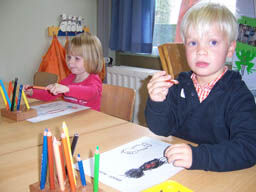 En natuurlijk zelf een kindje samenstellen: de juf kleeft de buik op en de kinderen moeten zelf de armen, de benen, het hoofd, de handen en de voeten er bij kleven. Ze hebben dat mooi gedaan, hoor!