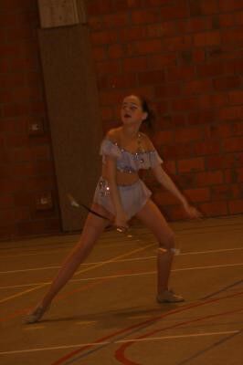 Deze prachtige soliste is Jolien Milisen.(klik op de foto voor een groter exemplaar) Ook zij neemt deel in de disciplines: Solo 1 baton, Solo 2 baton, Solo X-Strutting, Duo Twirling en Team Junior..