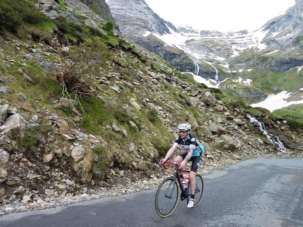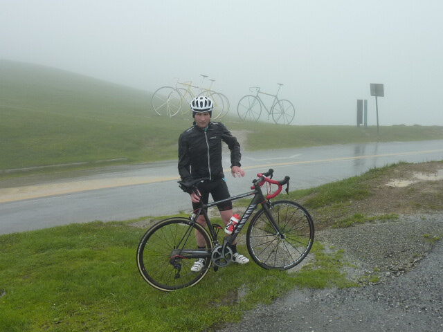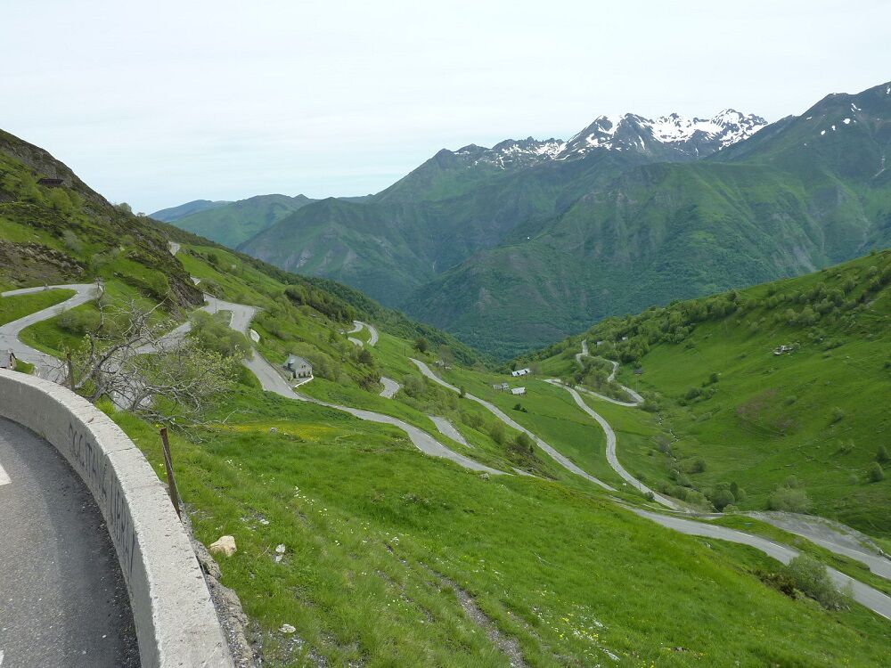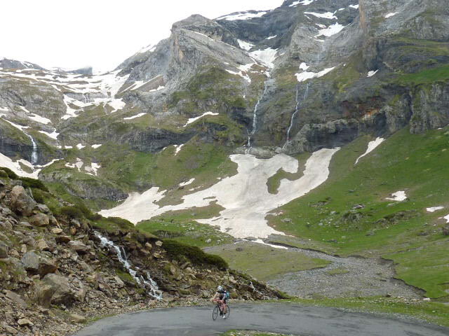 ... Maandag begon de dag nog mooi en warm. Ik liet Col d' Izpegui achter mij om eerst boodschappen te doen en nadien naar Port de Larrau te rijden. Onderweg begon het te regenen dat het niet te doen was. Maandag werd echt meer dan een uitgeregende dag. Boven op Port de Larrau nog even gewacht of het niet beter zou worden. Al snel bleek dat dit naïeve hoop was. Dan maar een stuk naar beneden gereden tot aan het dorpje Larrau. Daar was een camping. Geen slecht idee leek me dat met dat hondenweer. Plaats zat, maar de camping was zo goed als verzopen. Mevrouw zei ook nog eens dat het gans de week zo'n weer ging blijven. Zelf wist ik ook even van geen hout pijlen te maken en als een kieken zonder kop verder gereden niet wetend wat nu. Even van slag en het bleiten stond me nader dan het lachen. Even aan de kant om toch even alles op een rijtje te zetten. GPS ingezet richting een plaats en kijken om onderweg een slaapplaats te vinden. Na 10 a 15km zag ik in een dorp een parkeerplaats waar reeds een camper stond. Eten gekookt en nadien stopte het zowaar met regenen. Daar gebruik van gemaakt om te gaan wandelen. Wat was dat nodig om het hoofd eens leeg te maken. Nadien gekeken wat de opties waren, van plan B tot plan Z. Vele namen opgeschreven van plaatsen tot een stuk in Spanje waar ik het weer zou van opzoeken de dag nadien. Voor de eerste keer gedacht 'had ik nu maar een smartphone'. De dag nadien naar de 'Tourist Information' waar gratis WIFI was. Na maandag zou dinsdag en woensdag het rijtje van drie-op-een-rij -slecht-weer-dagen vervolledigen. Nadien werd beterschap voorspeld. Plan B werd het dan maar Naar Luz Saint Sauveur, een plaats dat ik reeds goed ken. In moeilijke omstandigheden grijpt men terug naar iets bekend zeker? In de namiddag moest ik over Col d'Aubisque. Boven op de col auto aan de kant en nagedacht om hem toch in de gietende regen nar beneden te rijden om hem te beklimmen. Thermisch onderlijfje, truitje, windstopper, regenjas 1 en regenjas 2, tot plastiek zakken rond mijn voeten. Bbrrr... ijskoud gehad in de weg naar beneden. pas na zo'n 2km klimmen kwam er wat warmte in mijn bovenlijf, de benen bleven nog wat langer aanvoelen als ijspegels. Klimmen naar een droge camionette die op de top staat is wel een goede motivatie. 'Vive le soleil' euhh 'Vive le Velo'. Nadien stuk naar beneden gereden, naar een parking op Col de Soulor waar altijd veel campers staan. Deze keer geen enkele mobilhome te zien. Dan maar wat verder naar beneden.