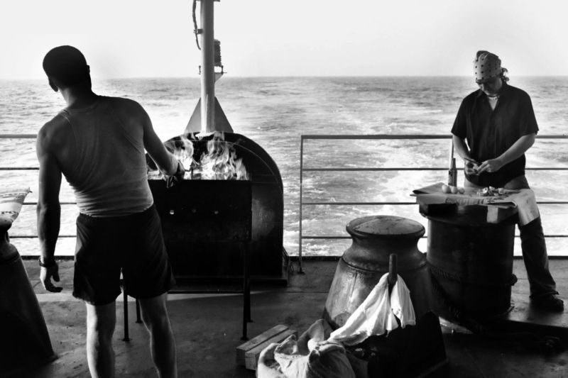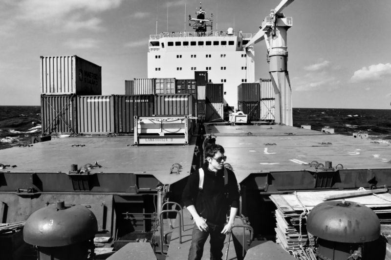 We zijn in de Golf van Biskaje, halfweg Frankrijk. Gisteren voeren we de Noordzee door langsheen het Engels kanaal. Yura, de 3de officier brengt ons op de hoogte dat we binnen enkele uren zullen communiceren met Finisterre traffic. Tegen die tijd zal het schip zich ter hoogte van Spanje bevinden. Ik tel de minuten en wacht op de zeeziekte die maar niet komen wil. De nachten op zee zijn een wonder. Buiten het geronk van de scheepsmotoren is er enkel rust. Het geruis van de zee maakt me een beetje te filosofisch. Ik krijg stilaan de indruk dat ik mijn roeping als zeeman gemist heb. Samen met Werner probeer ik de 17-koppige bemanning te lokaliseren. Maar iets moet ons ontgaan zijn want onze telling stopt steeds weer op 9.