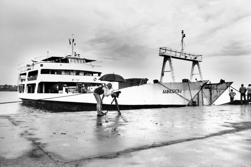Na de middag verlaat het schip de kaai en varen we richting het sluis ter hoogte van Doel. Met de camera in de aanslag kijken we vol verbazing naar het voorbijschuivende landschap. Het is adembenemend. De donkergrijze lucht creëert mooie contrasten. Ik kan mijn vreugde haast niet bedwingen. Ik kijk Werner even aan en merk dat we beiden met de zelfde gedachte worstelen. Het ongeloof dat we Antwerpen verlaten en op weg zijn naar het verre Afrika.