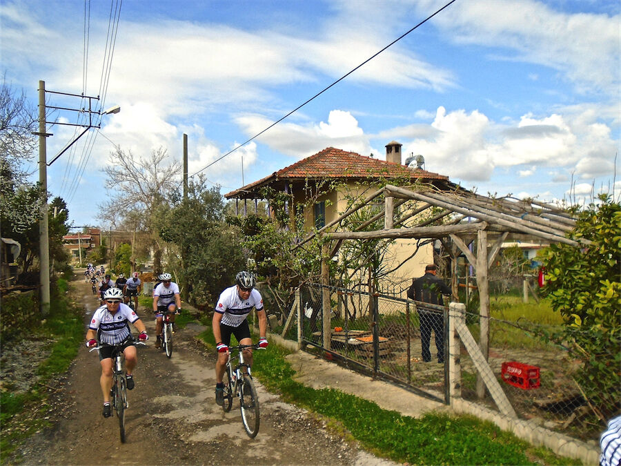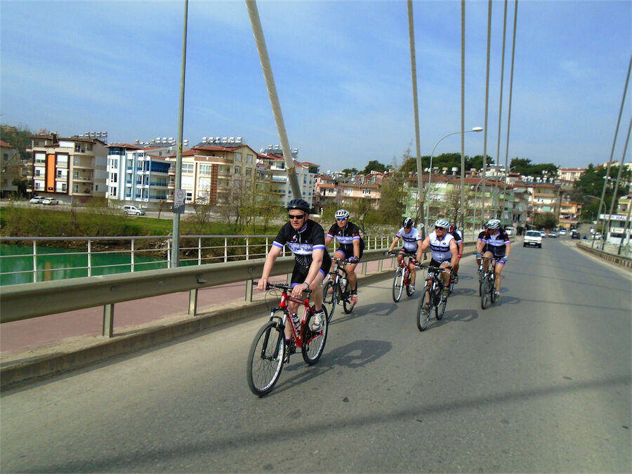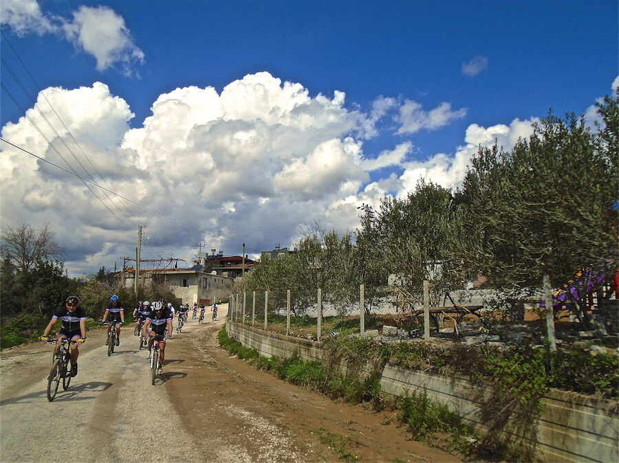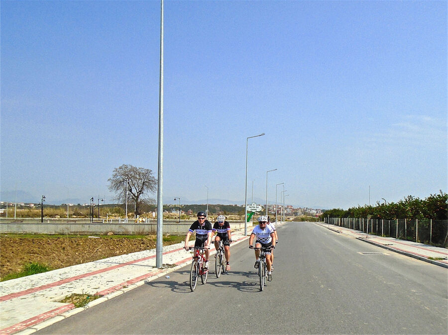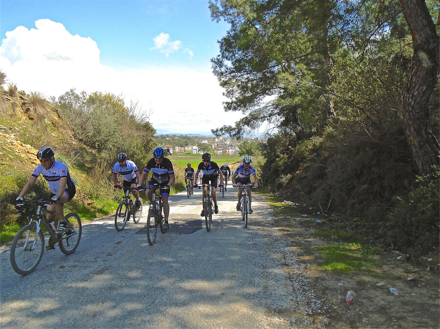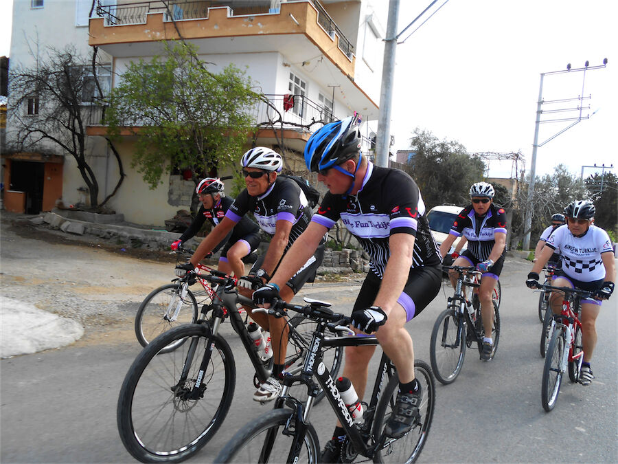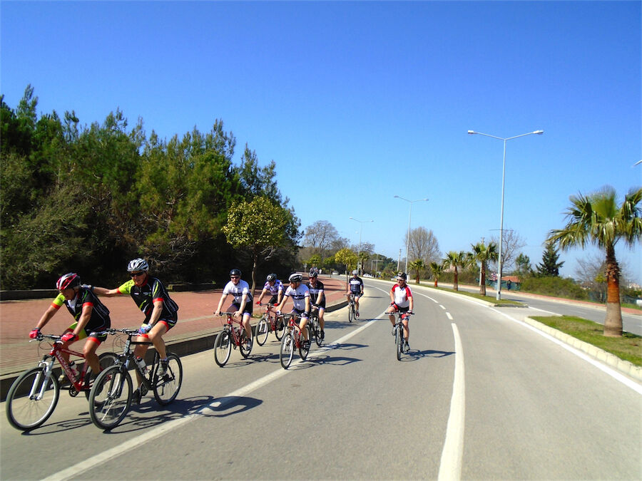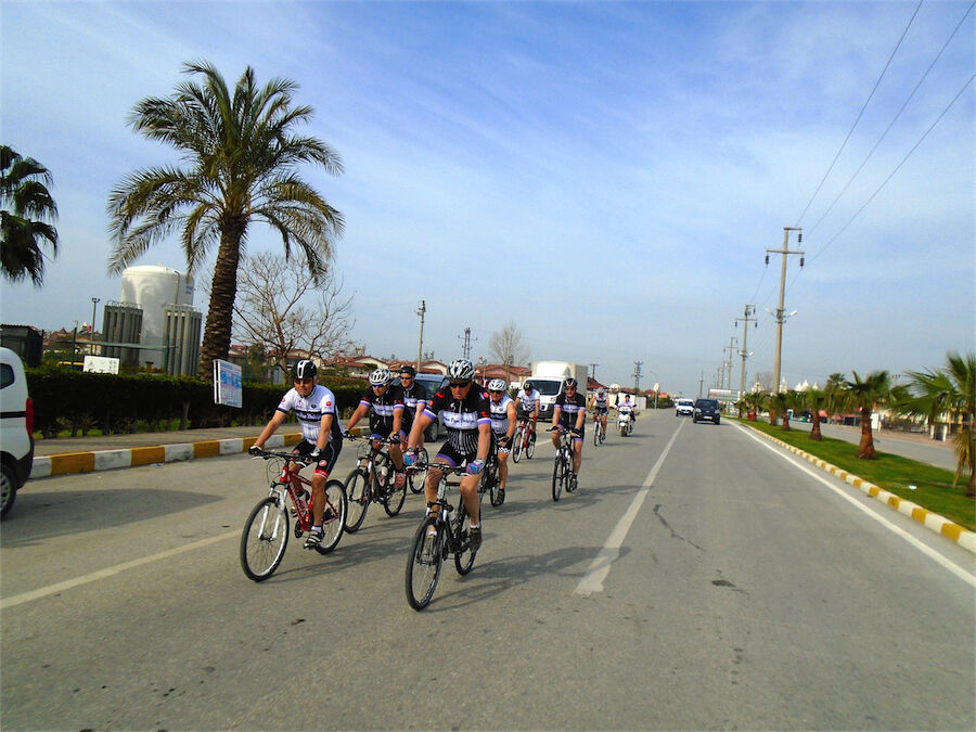 Zon en bewolking. Met 2 groepen gefietst. Een groep geplande tocht langs Aspendos gedaan. 66 km. Andere groep door zware bewolking op hun route een nieuwe tocht gedaan met nieuwe off-road wegen. 73 km