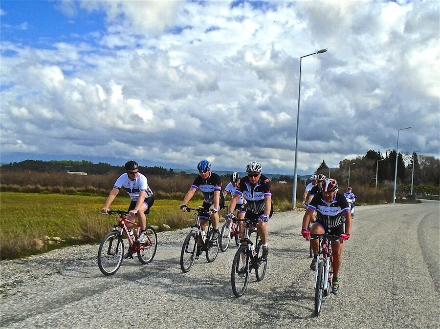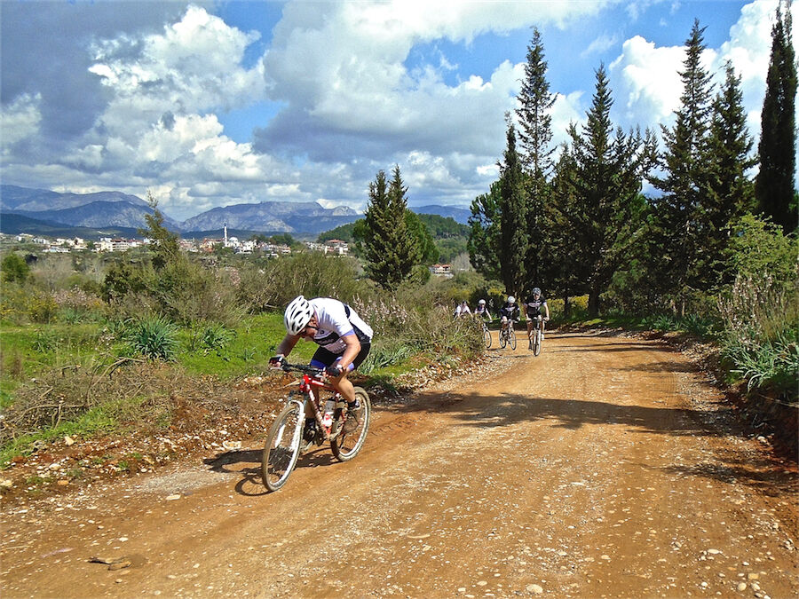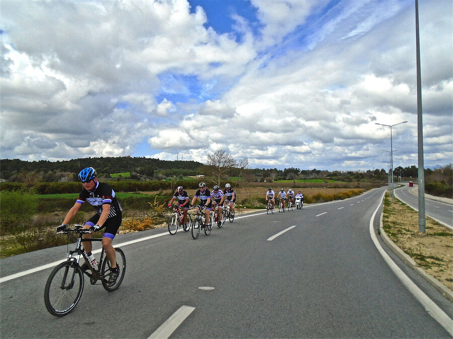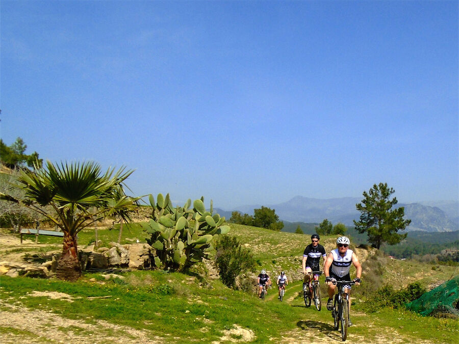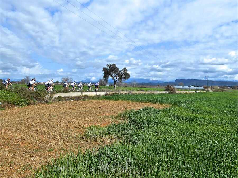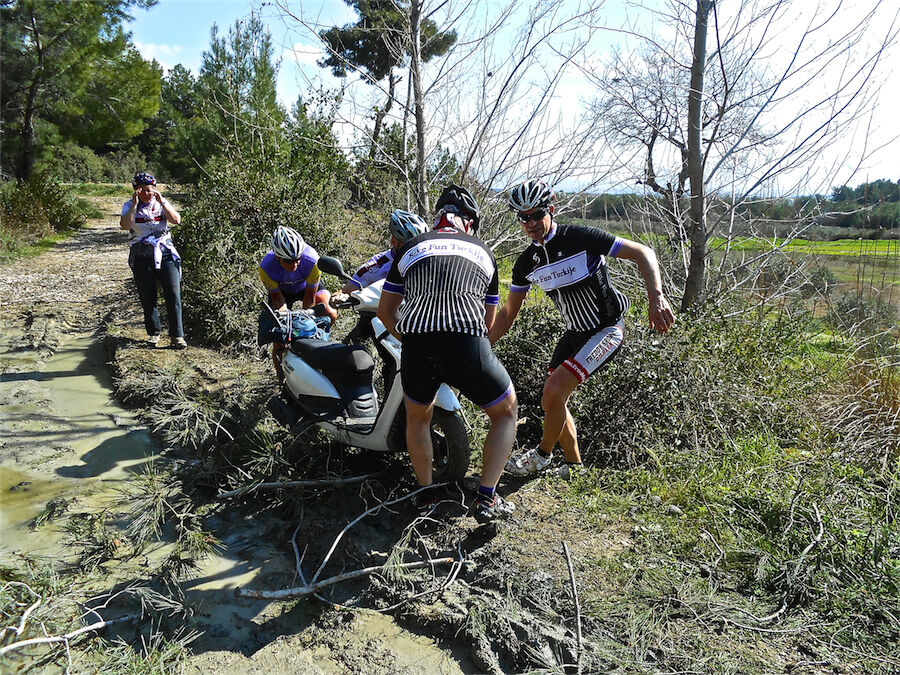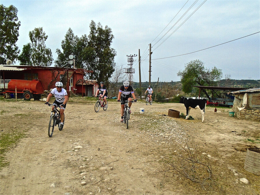 Zon en bewolking. Met 2 groepen gefietst. Een groep geplande tocht langs Aspendos gedaan. 66 km. Andere groep door zware bewolking op hun route een nieuwe tocht gedaan met nieuwe off-road wegen. 73 km